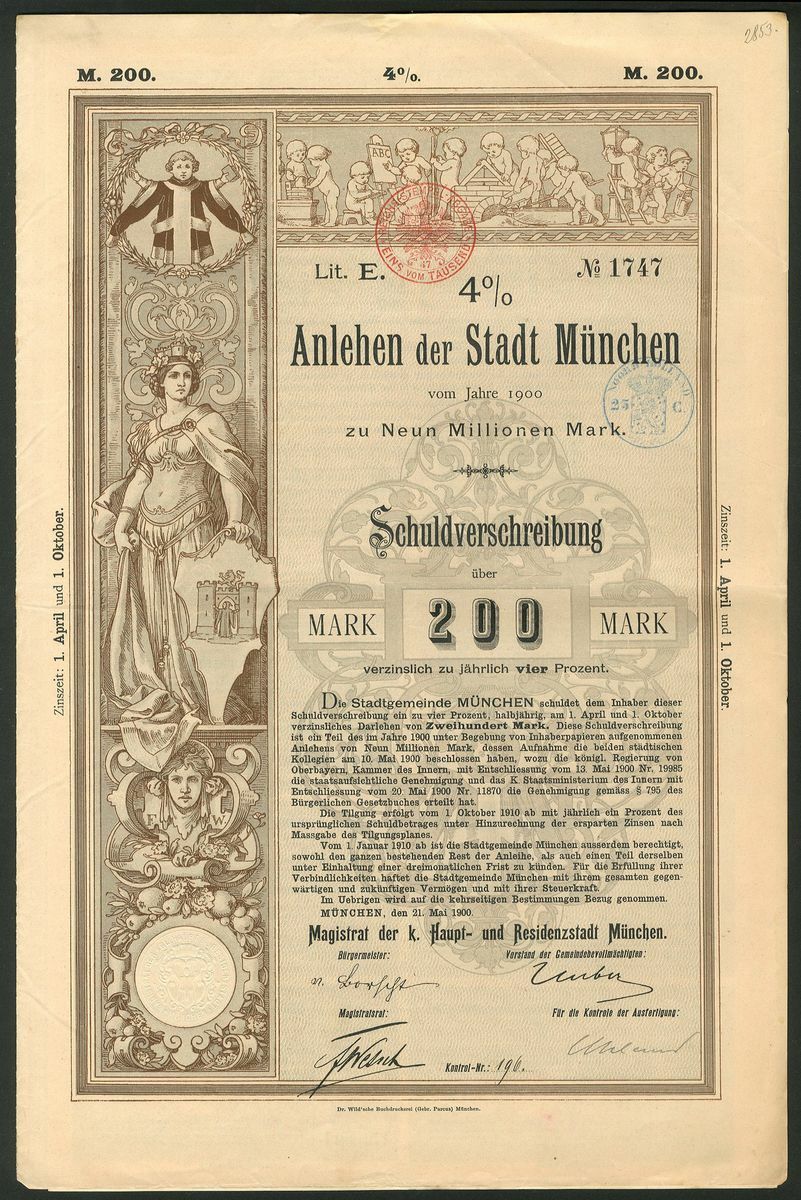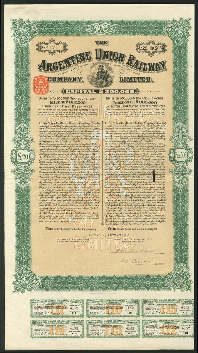 A Group of World Bonds and share, including City of Munich, 1900, 200 marks; Argentine Union Railway Co. Ltd., £20 debenture, 1910, 2 examples; Philadelphia & Reading Railroad Company, $1000, 1882; a group of 25 various Russian bonds, and, China, 1914 Industrial Loan, 500 francs, and others mainly French and Belgian (12). Mostly VF and better (42).