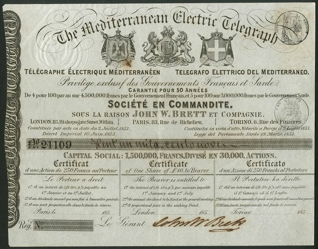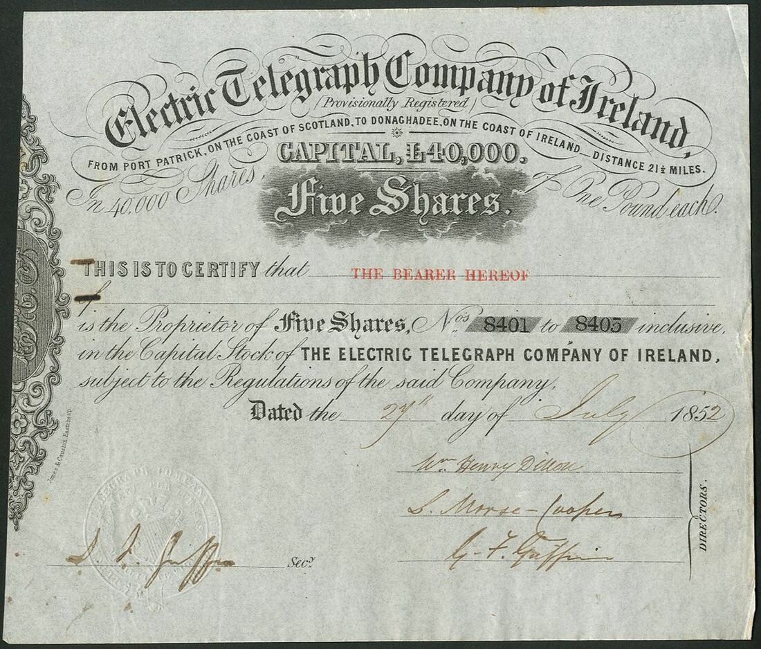 Telegraphs: A pair of certificates comprising, Electric Telegraph Company of Ireland, 5 shares, 185[2], and Mediterranean Electric Telegraph, one share of £10, 1853. Both about EF (2).