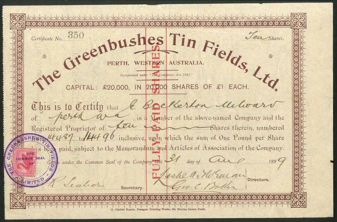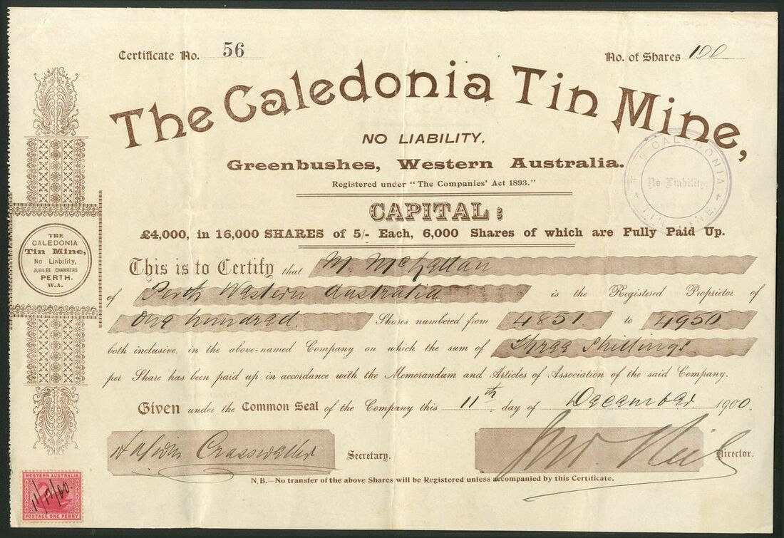Australia: A good pair of Greenbushes Tin companies, comprising Greenbushes Tin Fields Limited, £1 shares, 189[9], #350, brown, adhesive revenue stamp, and, Caledonia Tin Mine, No Liability, 5/- shares, 190[0], #56, brown, adhesive revenue stamp. Greenbushes in Western Australia has some of the worlds largest deposits of Tin, Lithium and Tantalum. Currently the Greenbushes mine is the larest Lithium producer in the world. Both VF (2).