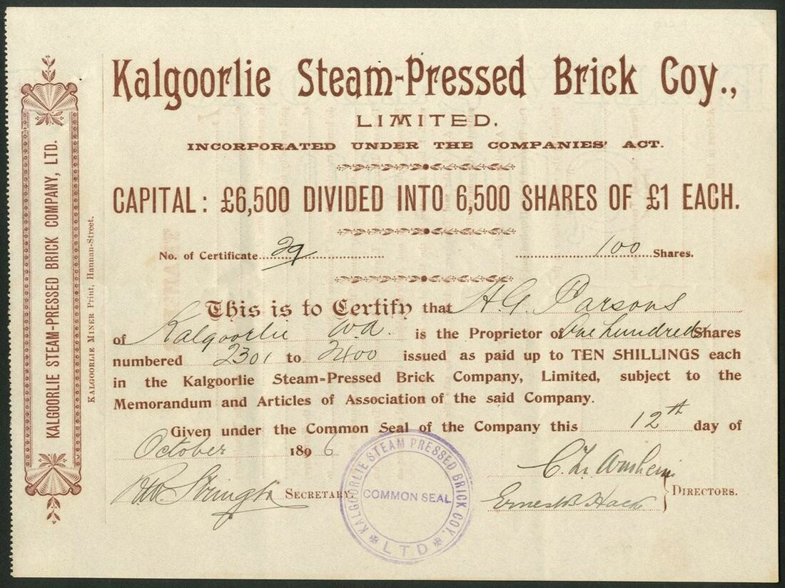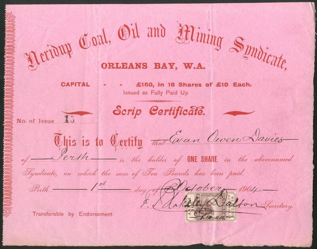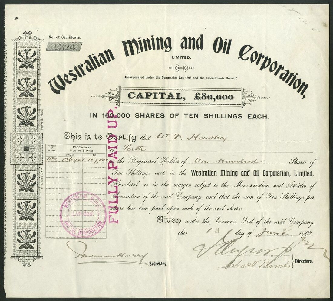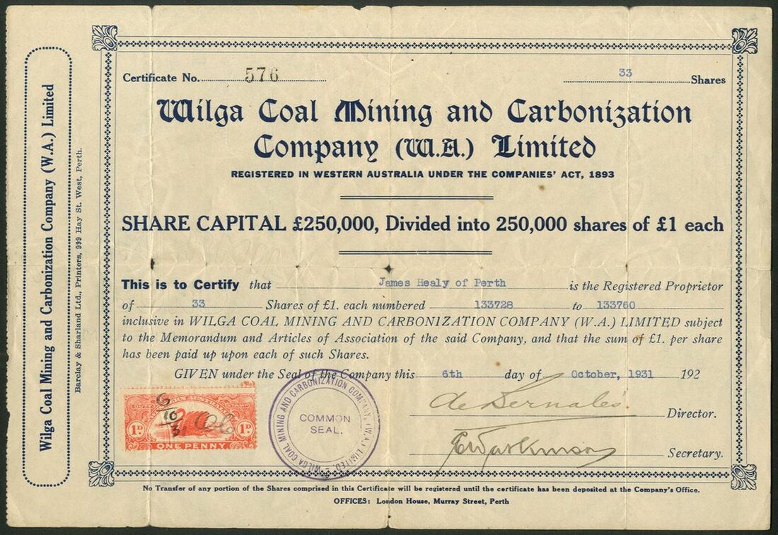 Australia: A small group of Western Australian companies, comprising Wilga Coal Mining and Carbonization Company (W.A.) Limited, £1 shares, 192[31], #576; Neridup Coal, Oil and Mining Syndicate, £10 share, 190[4], #15, of only 16 issued; Westralian Mining and Oil Corporation Limited, 10/- shares, 1902, #1324, and, Kalgoorlie Steam-Pressed Brick Coy., Limited, £1 shares, 189[6], #29. Fine to GVF (4).