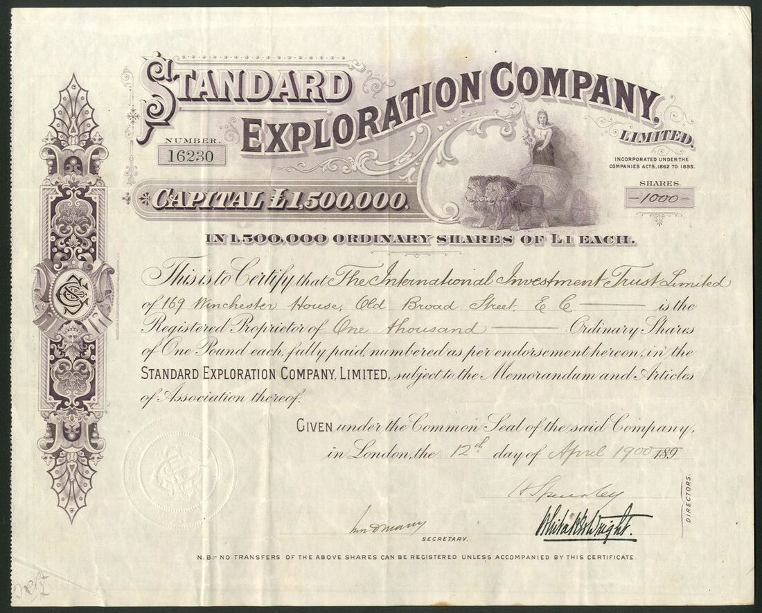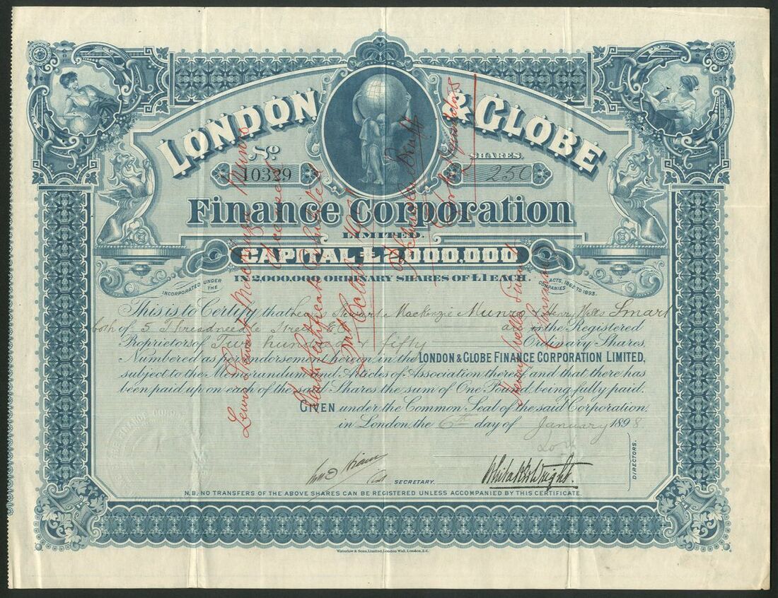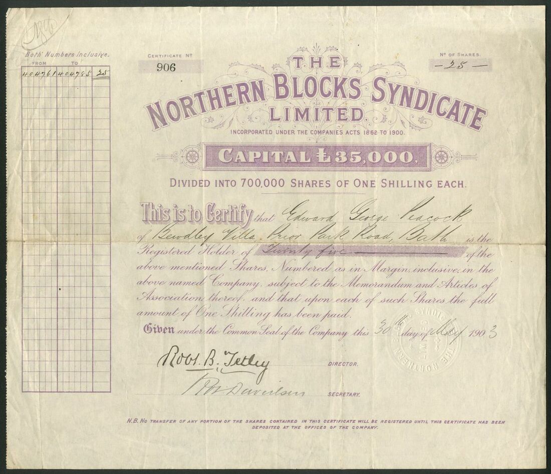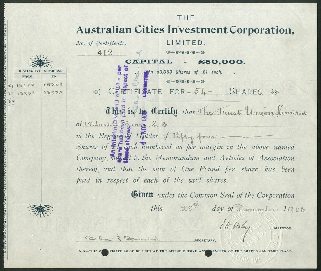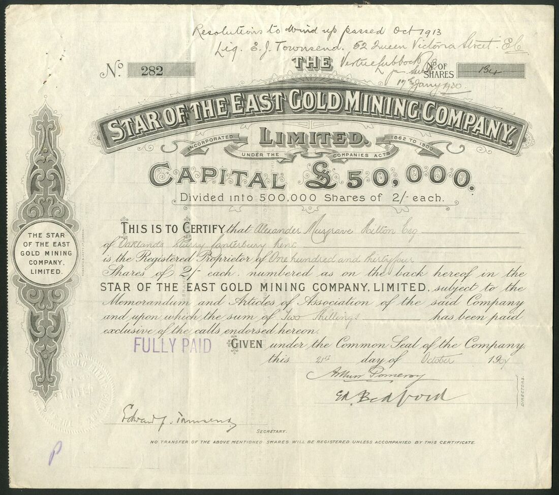 Australia: A group of mostly Western Australian certificates, comprising Star of the East Gold Mining Company Limited, 2/- shares, 19[07], #282; Northern Blocks Syndicate Ltd., 1/- shares, 190[3], #906; Standard Exploration Co. Ltd., £1 shares, 189[1900], #16230; London & Globe Finance Corporation Ltd., £1 shares, 189[8], #10329, this with endorsements on face, and, Australian Cities Investment Corporation Ltd., £1 shares, 1[906], #412. F-VF (5).