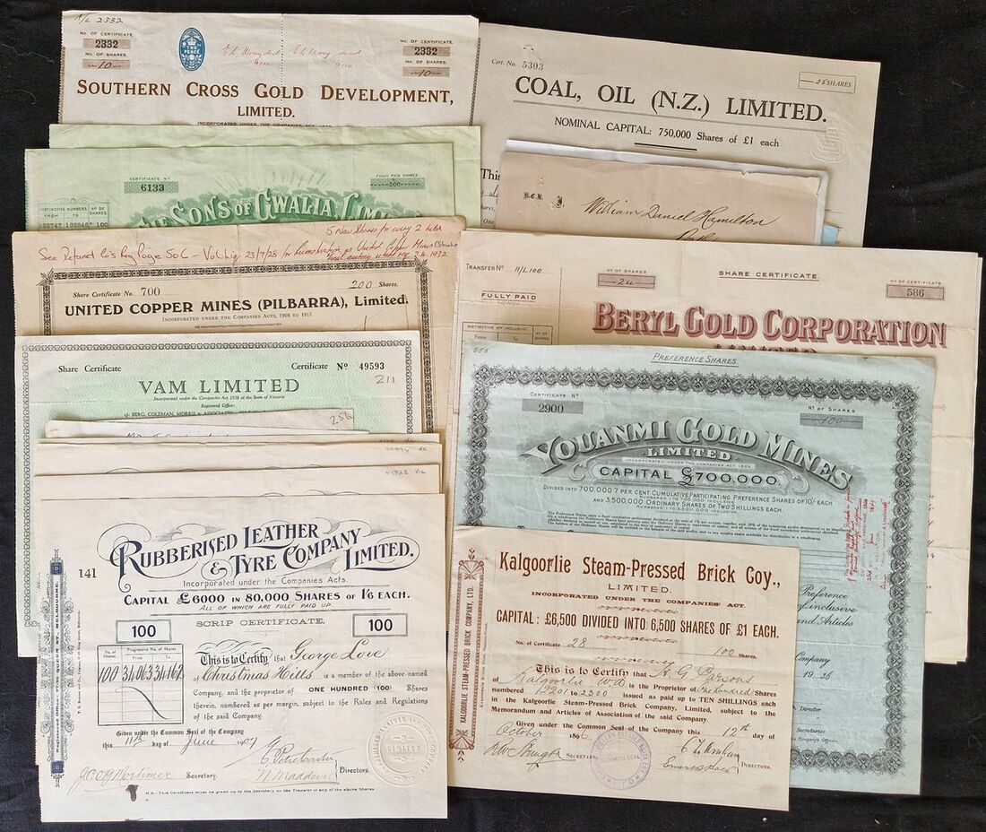 Australia: A group of mining and other certificates, many from Western Australia, including Kalgoorlie Steam-Pressed Brick Coy., Limited, 189[6]; Rubberised Leather Tyre Co. Ltd., 19[07], 6 examples; Youanmi Gold Mines Limited, 19[36], and, Beryl Gold Corporation Limited, 19[34], 3 examples. See images for other items. Mixed condition, F-VF (22).