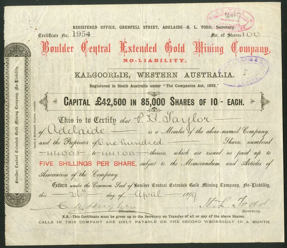 Australia: Boulder Central Extended Gold Mining Company, No Liability, 10/- shares, 189[9], #1954, 5/- paid, red and black. A South Australian Company working mines at Kalgoorlie, Western Australia. AVF.