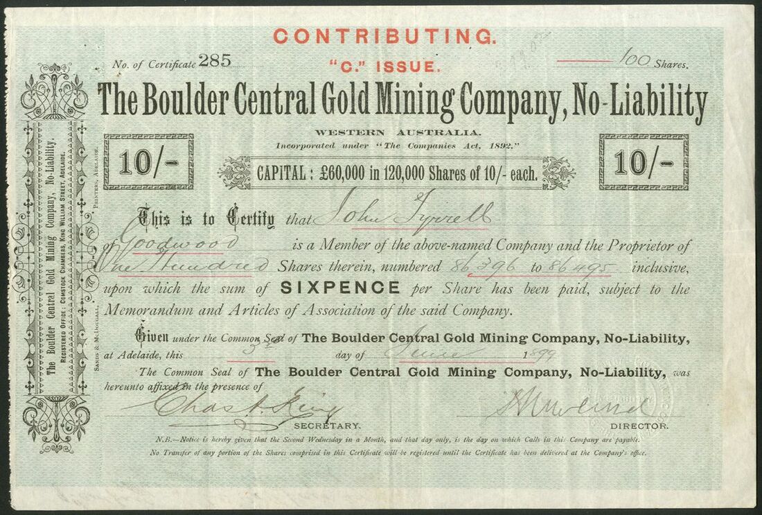 Australia: Boulder Central Gold Mining Company, No Liability, 10/- shares, Contributing 'C' issue, 1[899], #285, 6d paid, black with blue underprint. A South Australian Company working mines in Western Australia. VF.