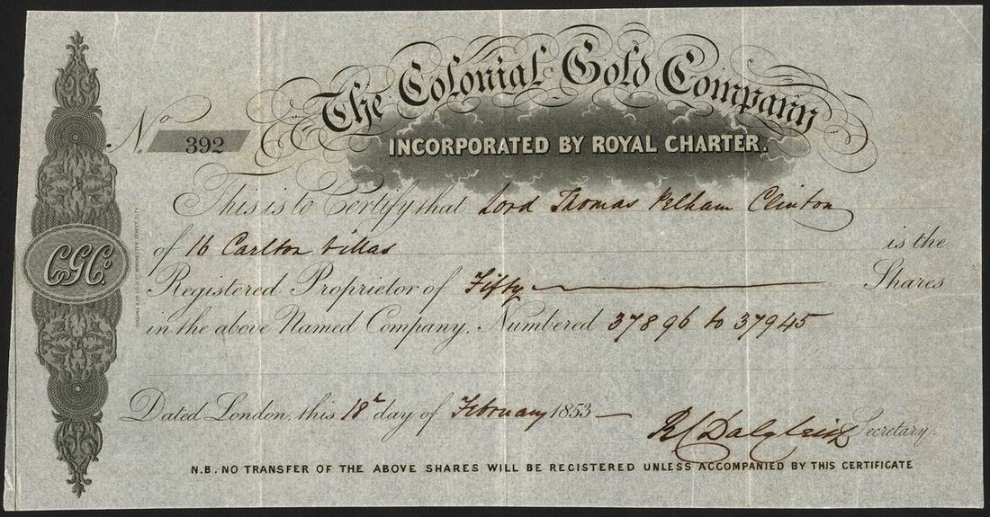 Australia: Colonial Gold Company, [50] shares, London 1853, #392, issued to Lord Thomas Pelham Clinton, scrollwork at left, black. A company incorporated by Royal Charter and one of many formed in the early 1850's after gold was found in New South Wales. GVF and rare.