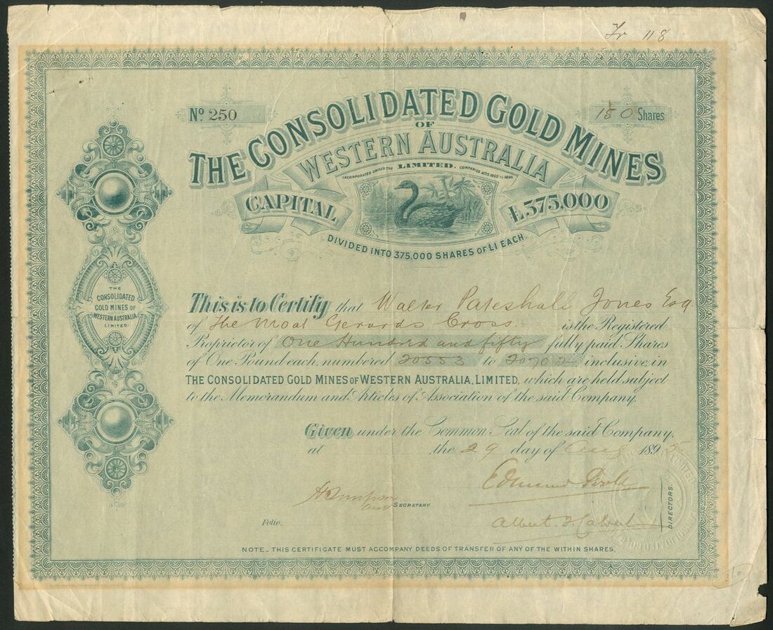 Australia: Consolidated Gold Mines of Western Australia Ltd., £1 shares, fully paid, 189(5), #250, attractive piece with vignette of swan, ornate border and scrollwork, green, printed by Waterlow & Sons. Reconstruction of company of the same name, owning the Coongan mining lease in the Marble Bar District. Also amalgamated with other companies in the area including Nicol Gold Mines and West Mallina Gold Mines. Reconstructed again in 1898. Tide mark from prior framing and a few edge nicks hence low estimate. F-VF.