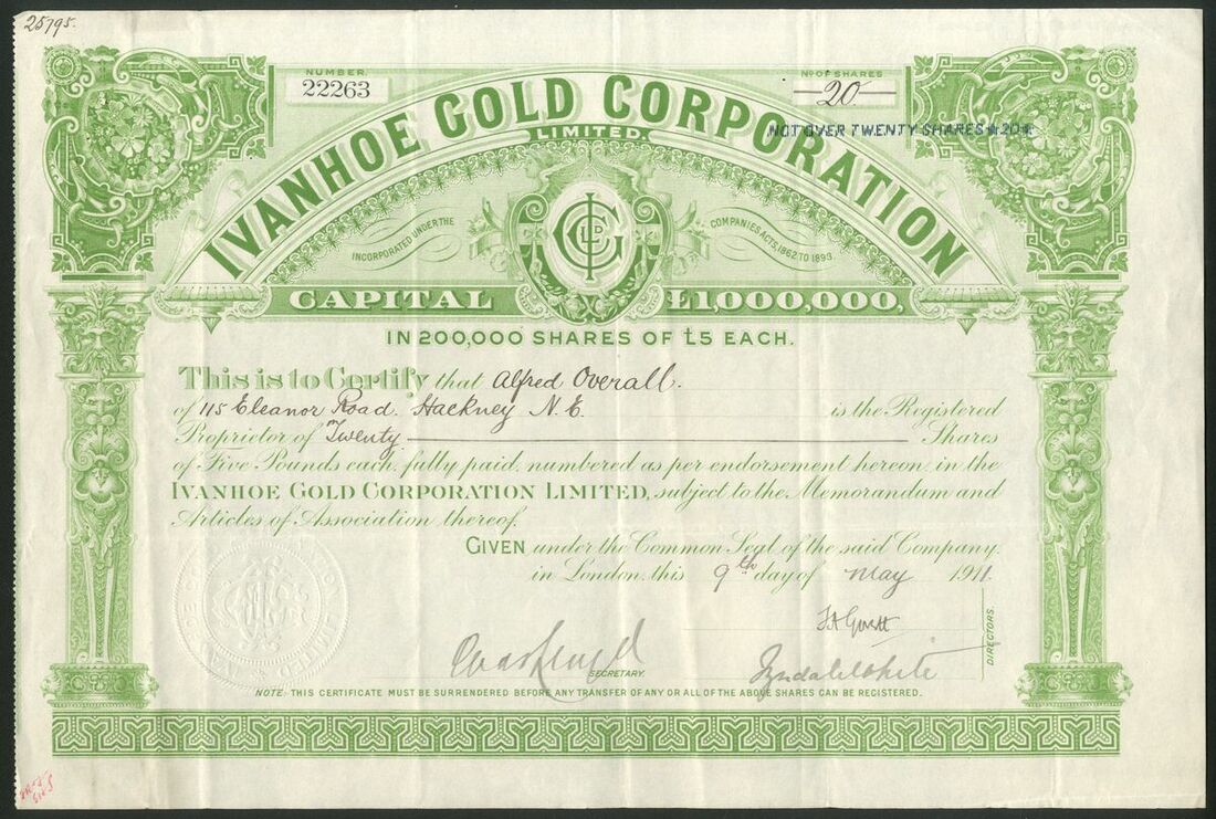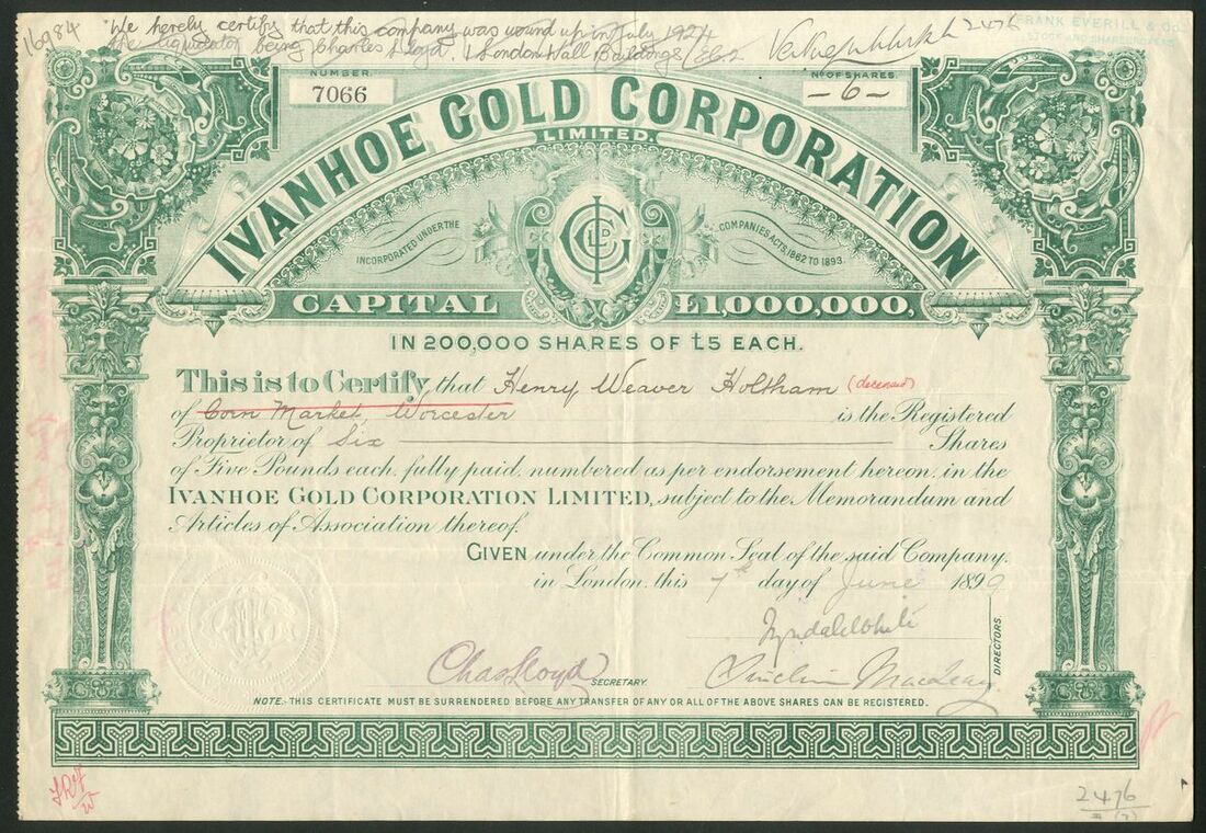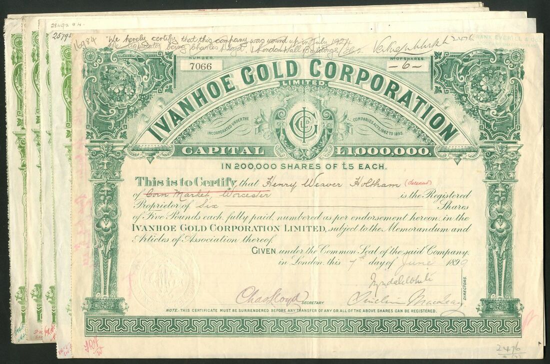 Australia: Ivanhoe Gold Corporation Limited, a group of 11 certificates for £5 shares, 189[9] through to 19[34], green, the later dates printed by Waterlow & Sons. There are 3 printing varieties and also the last is issued and signed by the liquidators. Registered 14th October 1897 to acquire the property of Ivanhoe Gold Mining Company, No Liability in the Hannan's District, Western Australia. Generally VF (11).