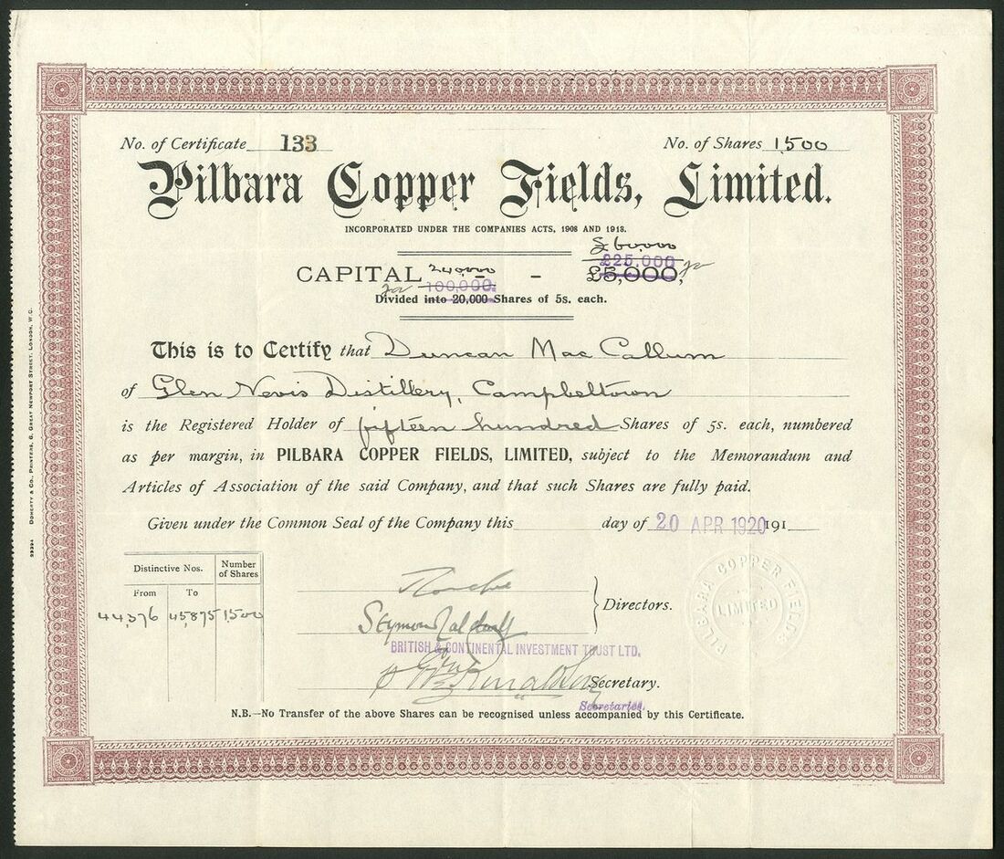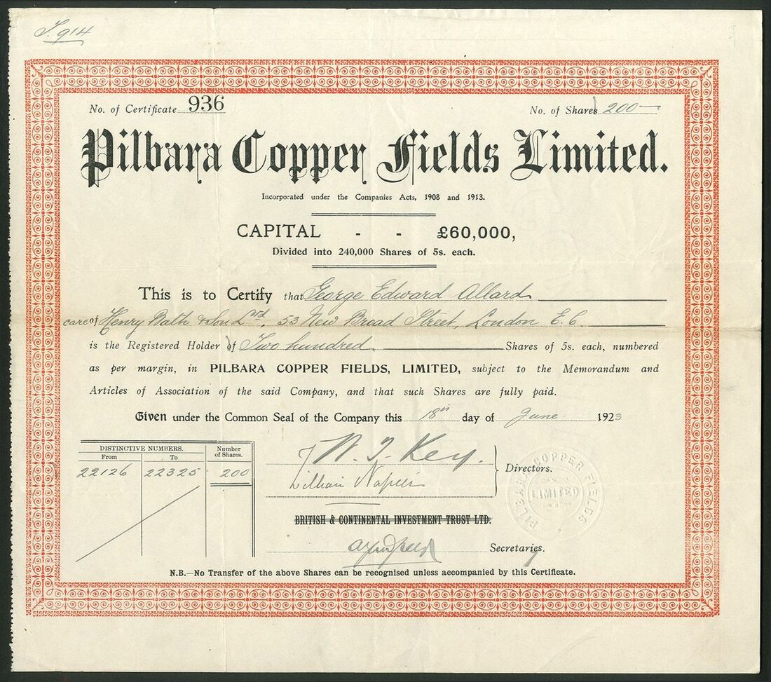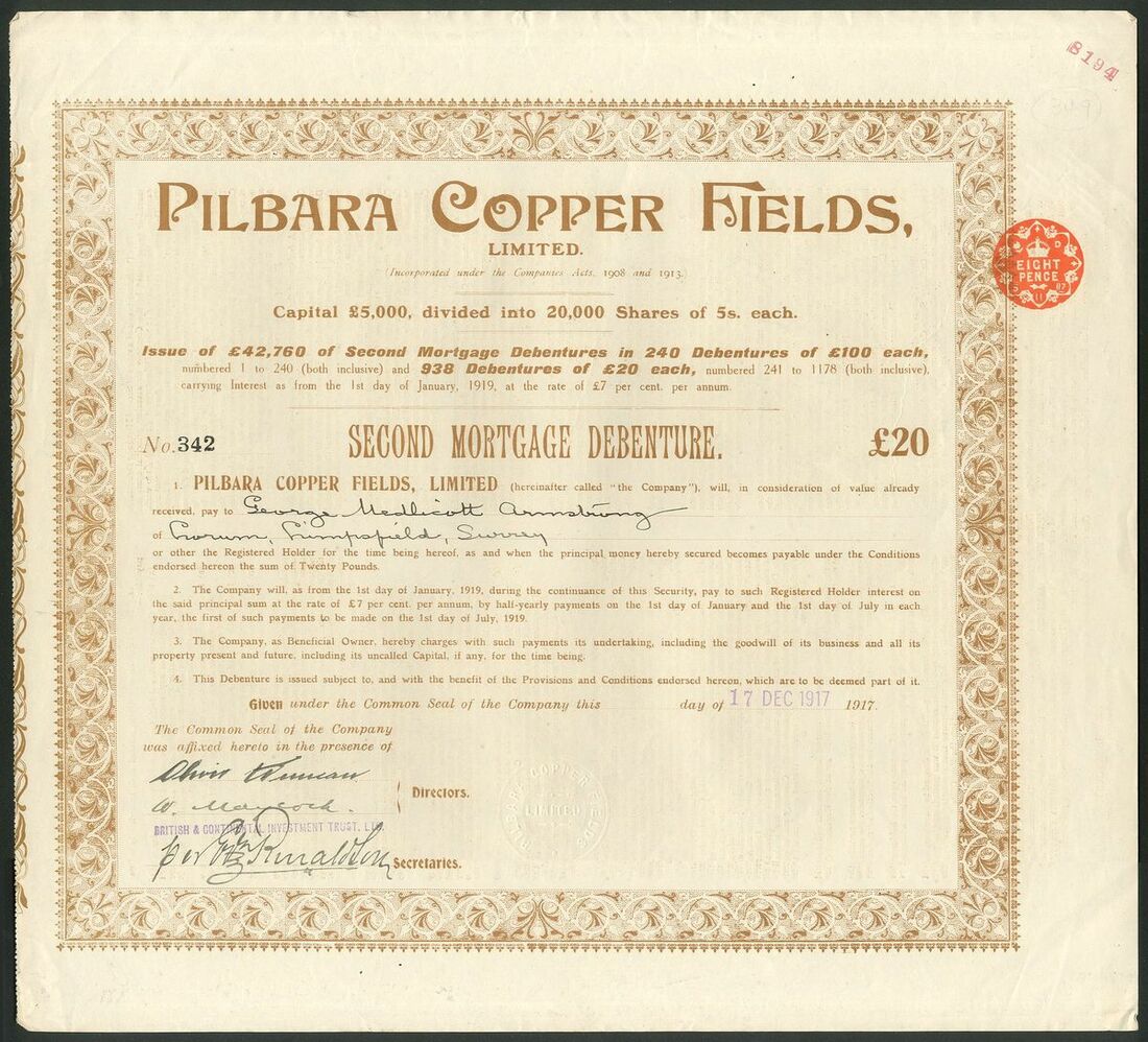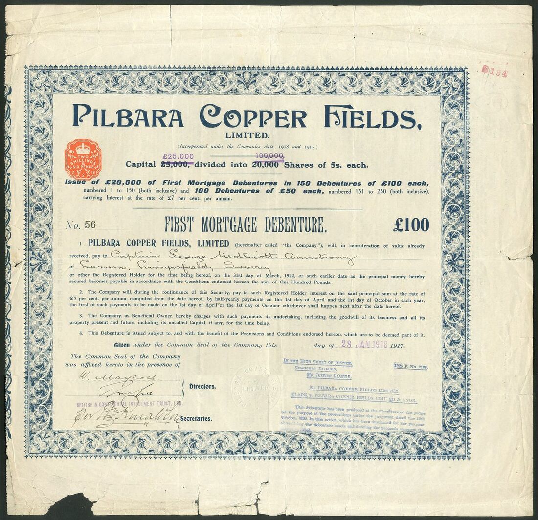 Australia: Pilbara Copper Fields Limited, a collection of 4 different certificates comprising 5/- shares, 191[20], #133, mauve; 5/- shares, 192[3], #936, red; £100 First Mortgage Debenture, 1917, #56, blue, and, £20 Second Mortgage Debenture, 1917, #342, yellow. Registered 21st January 1917 to acquire property from the receivers of the Whim Well Copper Mines Limited at Whim Creek, Pilbara, North Western Australia. Generally VF but the 3rd is only F (4).