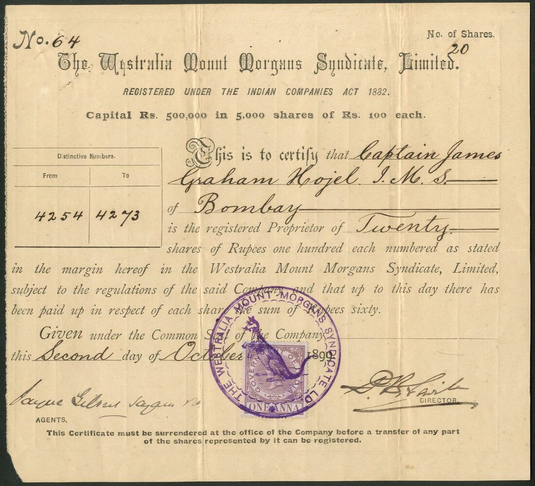 Australia: Westralia Mount Morgans Syndicate Limited, 100 rupee shares, 1899, #64, black, adhesive revenue stamp. A very interesting Indian company owning gold mining property at Mount Morgans, Western Australia. Tip of bottom left corner torn away otherwise VF and rare.