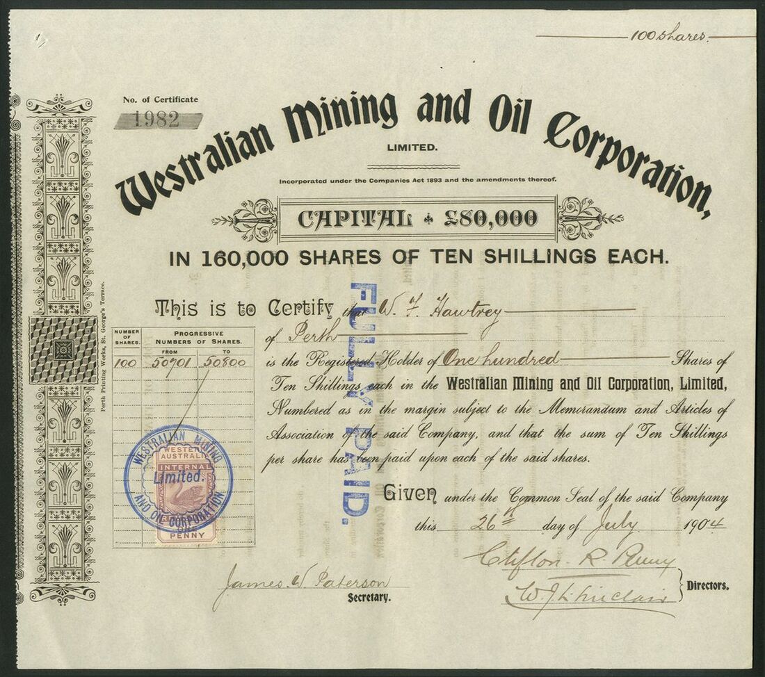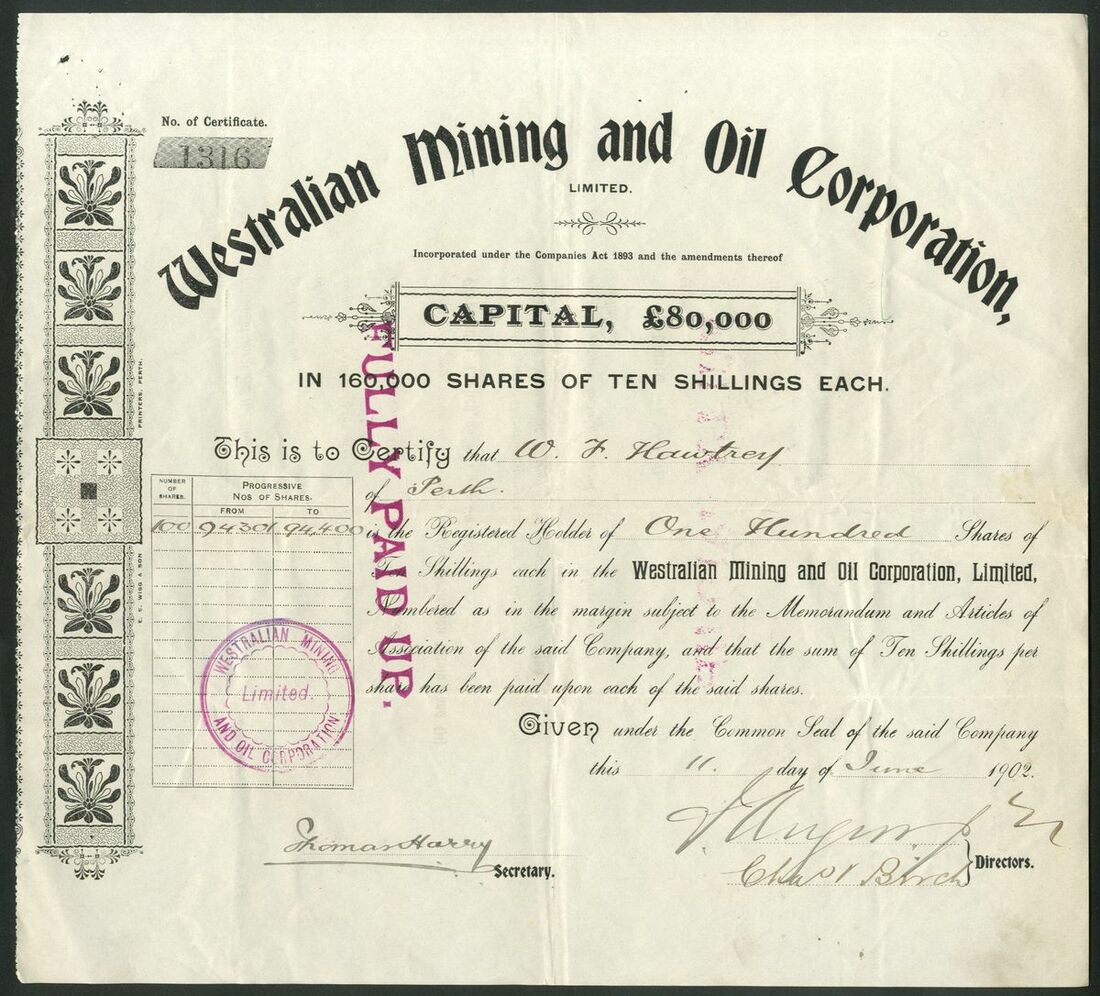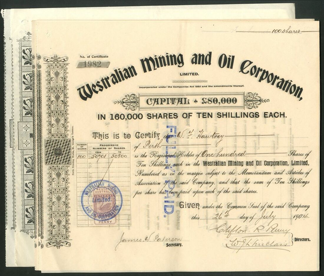 Australia: Westralian Mining and Oil Corporation Limited, a series of certificates for 10/- shares, 1902, 2 examples and 1904, 12 examples, different designs in black, local adhesive revenue stamps on the latter. Drilled in the Warren River District, Perth Basin between 1902 and 1904 but was out of business in the following year. VF and better (14).