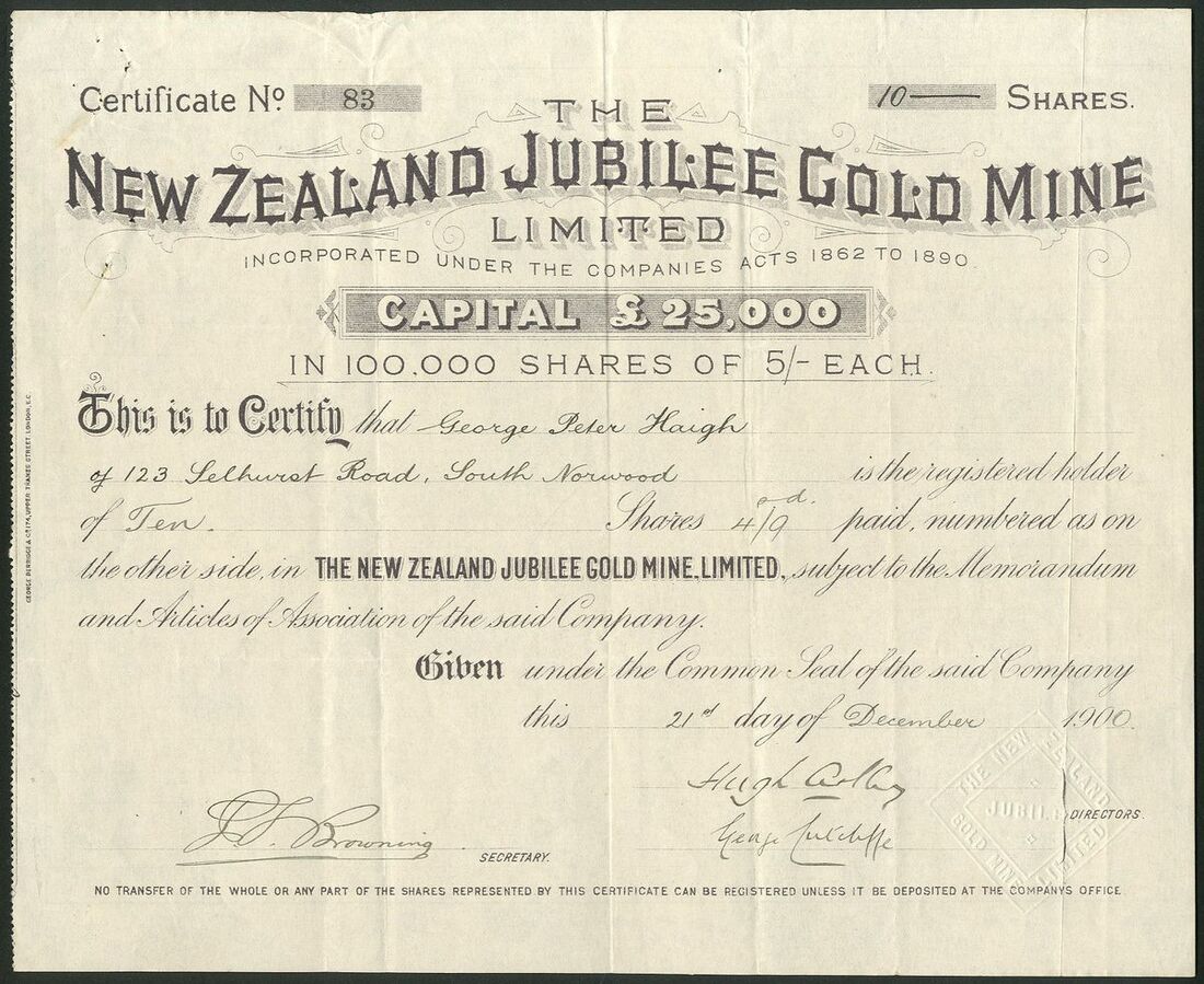 New Zealand: New Zealand Jubilee Gold Mine Ltd., 5 shilling shares, 190[0], #83, mauve printing. Formed to work 'The Jubilee' mining claim in the Upper Thames District, North Island. VF and first time this issue seen at auction.
