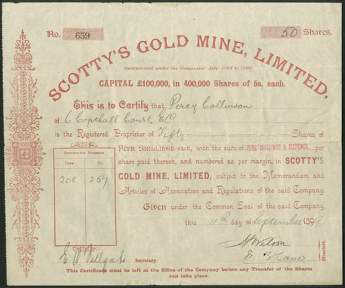 New Zealand: Scotty's Gold Mine, Limited, 5 shilling shares, 189[9], part paid, #659, red. A reconstruction of Scotty's Hauraki Gold Mining Company which owned a 19 acre property in the Coromandel District. VF.