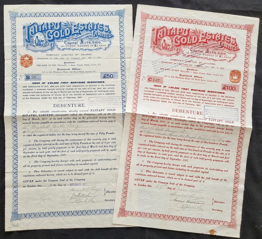 New Zealand: Taitapu Gold Estates Ltd., a pair of first mortgage debentures for £50 and £100, (1914) and (1915), #B26 and #C147, large format, ornate borders, small vignette of Maori at top left, blue and red respectively. Both GVF (2).