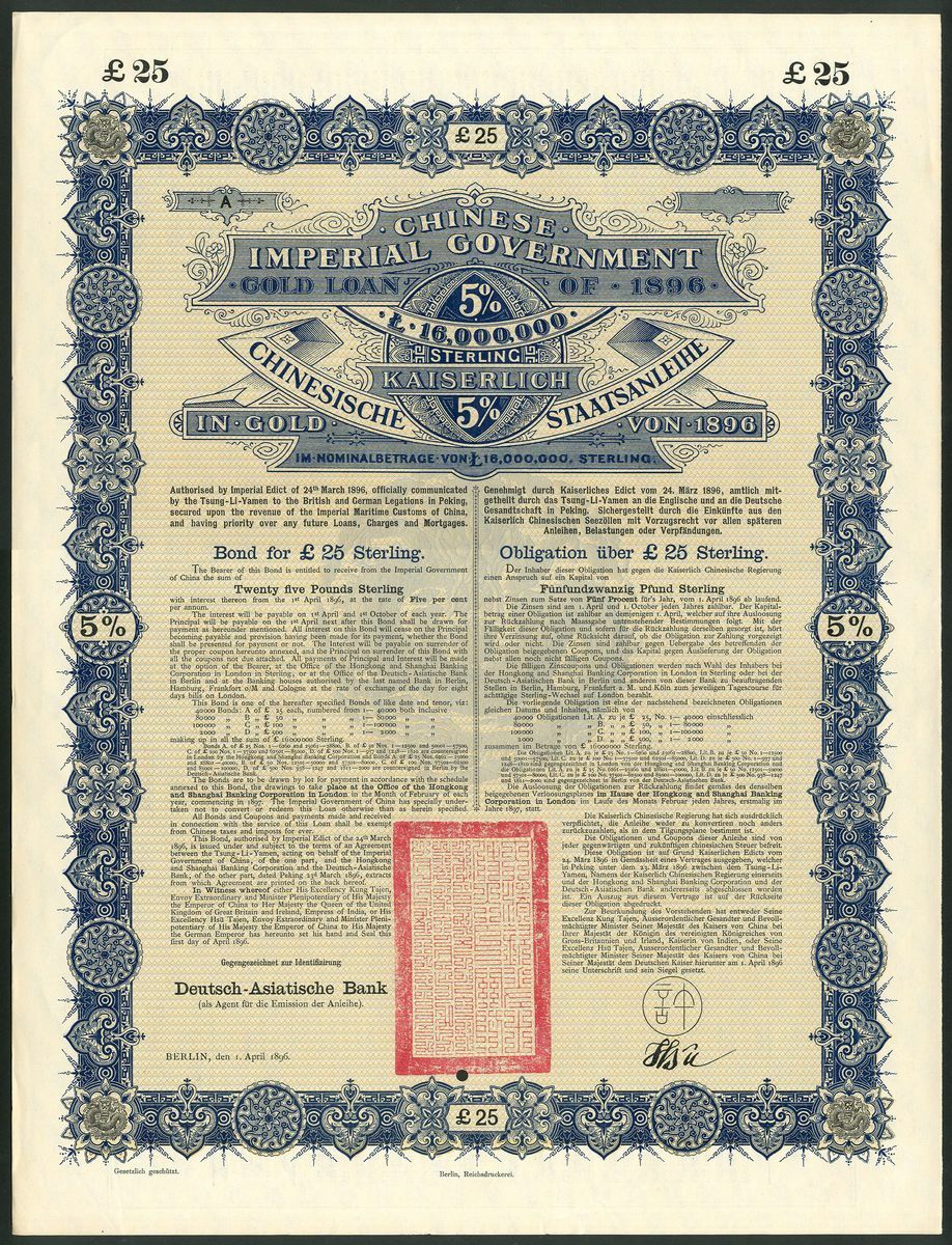 (x) China: 1896 5% Gold Loan, an unissued reserve stock bond for £25, issued by the Deutsch-Asiatische Bank, large format piece, blue and black, no coupons, small hole cancel. GEF.
