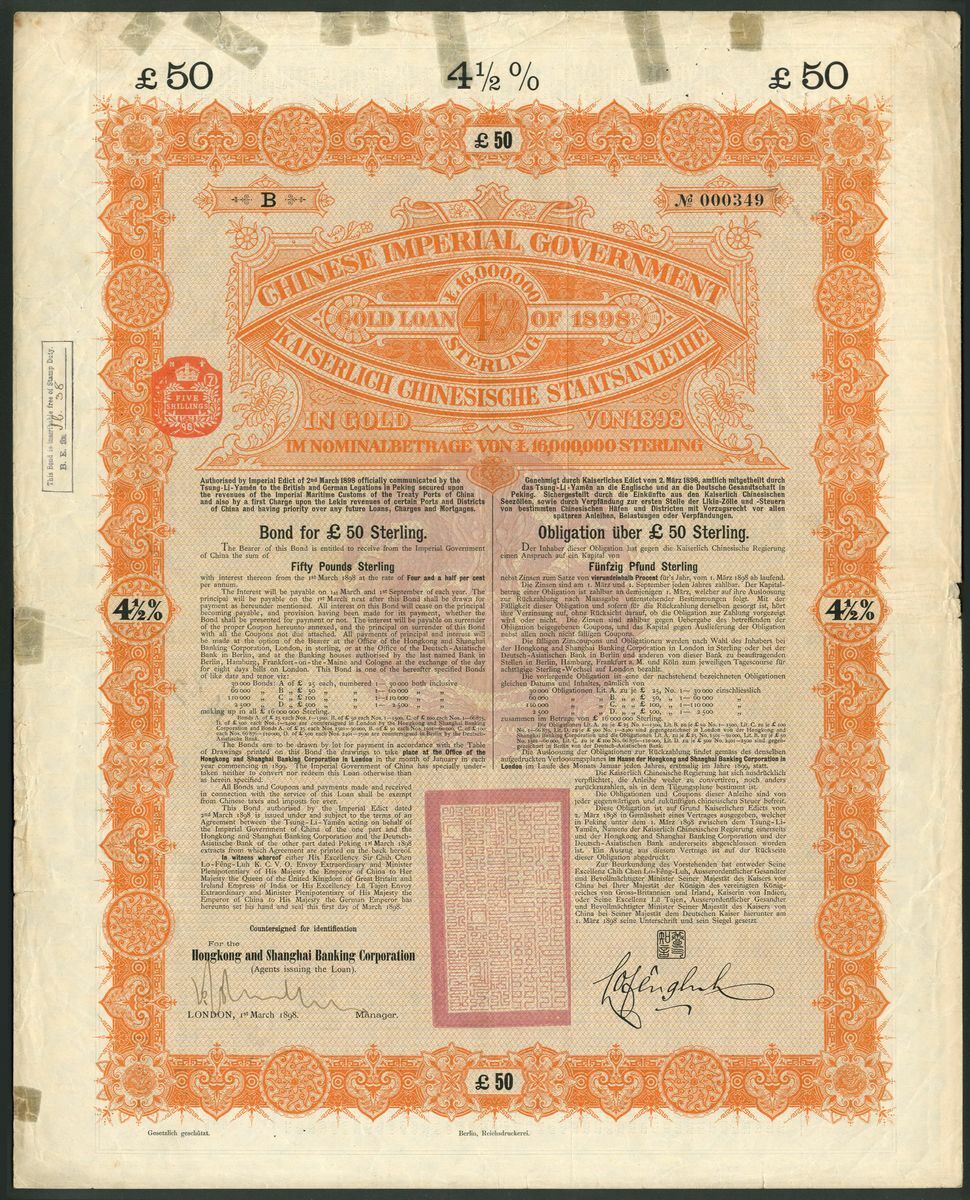 China: 1898 4½% Gold Loan, £50 bond issued by HSBC, #000349, large format, ornate border, orange and black, red chop in centre, with coupons. A few repaired tears at top edge otherwise VF.