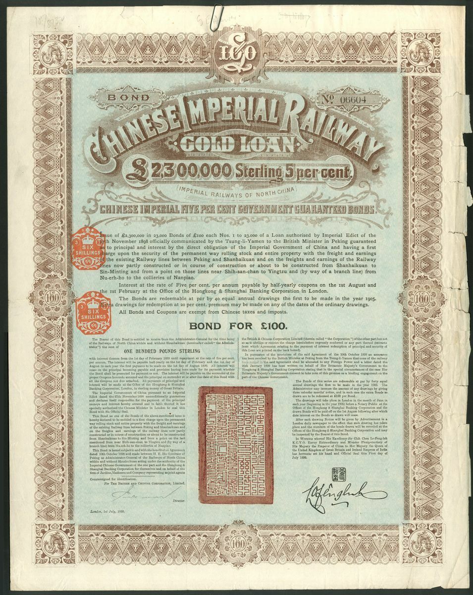 China: 1899 5% Imperial Railway Gold Loan, bond for £100, #06604, large format, ornate border, brown, blue underprint, with coupons. Minor tears in tight margin, small piece missing from top edge otherwise GVF.