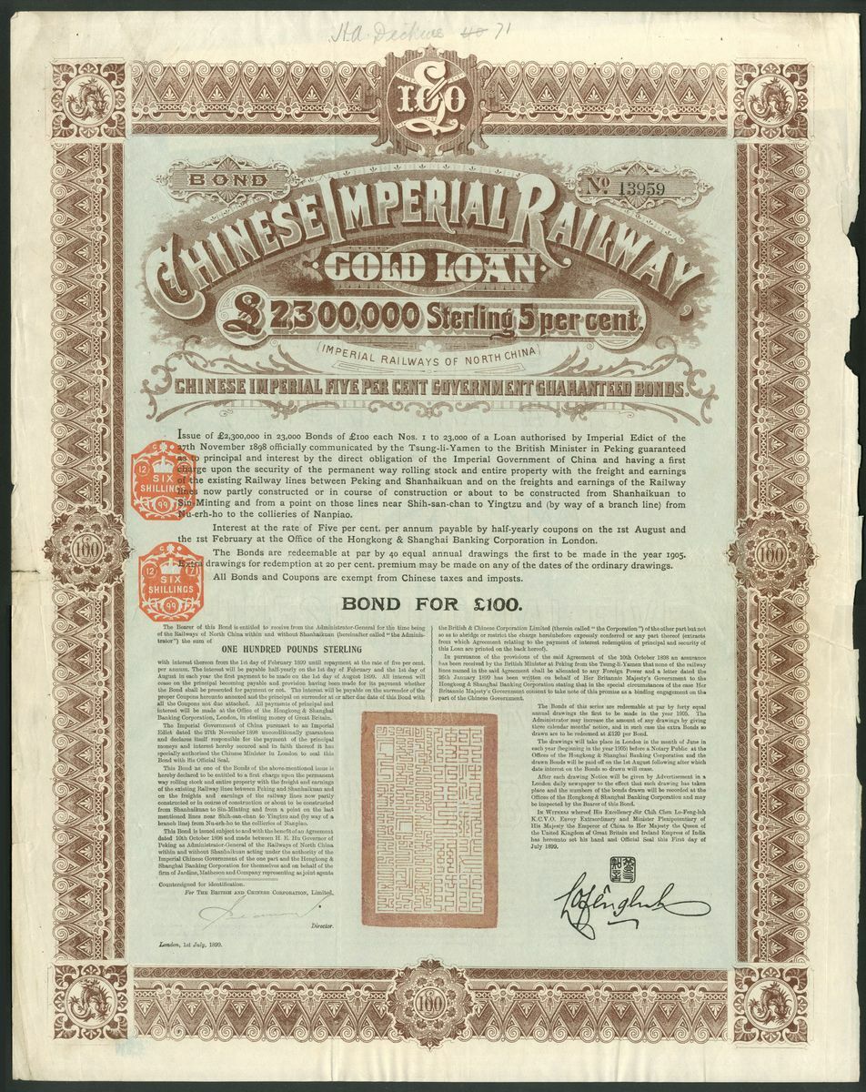 China: 1899 5% Imperial Railway Gold Loan, bond for £100, #13959, large format, ornate border, brown, blue underprint, with coupons. Better than usual, small tear at left GVF.