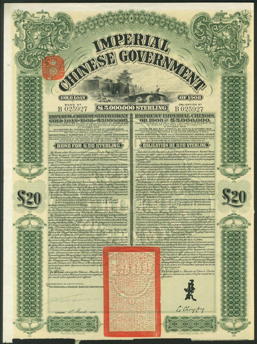 China: 1908 5% Gold Loan, Bond for £20 issued by the Hongkong and Shanghai Banking Corporation, #025927, walled city at top, green and black, red chop bottom centre, printed by Waterlow, no coupons remain as is usual. Much better than average condition for this issue. Near EF and scarce.