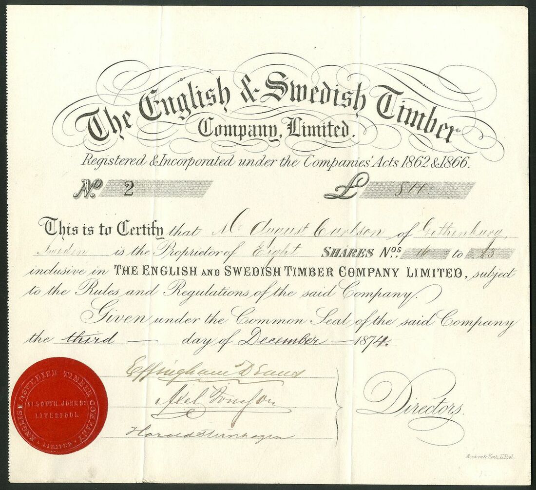 English & Swedish Timber Company Ltd., £100 shares, 187[4], #2, black, red paper seal. Issued to a shareholder in Gothenburg and two of the directors would appear to be Swedish but we cannot find more information. Forestry was, and still is, vital to the Swedish economy. In the 19th century it was over exploited for the iron industry, housing and farming leading to the Forestry Act of 1903. Company based in Liverpool. VF and rare.