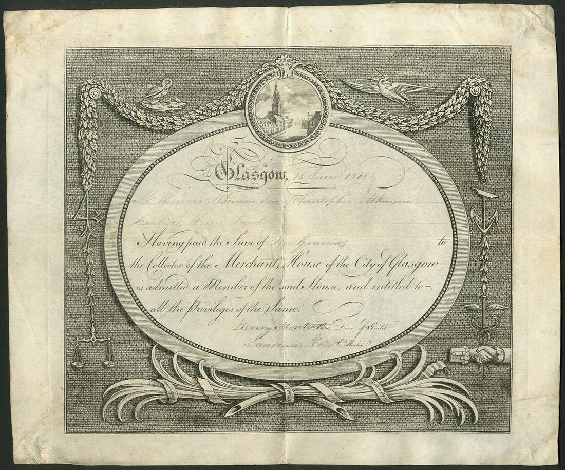 Great Britain: Glasgow Merchants House, membership certificate in the name of Thomas Atkinson, Glasgow [1818], attractive black printing, on vellum. An historic institution receiving its constitution in 1605. The Dean was also ex officio a member of the town council until abolished by act of 1973. The present building was erected in 1874 at the corner of West George Street and George Square. VF and rare.