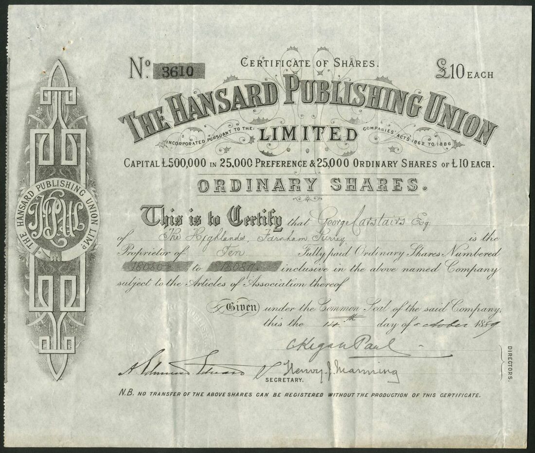 Great Britain: Hansard Publishing Union Ltd., a group of 4 different certificates comprising £10 ordinary shares and £10 preference shares, capital £375,000, and £10 ordinary shares and £10 preference shares, capital £500,000, all dated 18[89], 3 are handsigned by C. Kegan Paul. Hansard was a famous name for printing British Parliamentary debates from 1809. When Henry Hansard, the last family member involved in the business broke connection with the reports Horatio Bottomley stepped in to organise this company and also the printing firm of Kegan Paul, Trench, Trubner & Co. The rapid rise in the company's capital used for the acquisition of numerous other printing and publishing companies and the claims of fraud against Bottomley caused the failure in just 2 years. It was Bottomleys first of many appearances in court! VF (4).