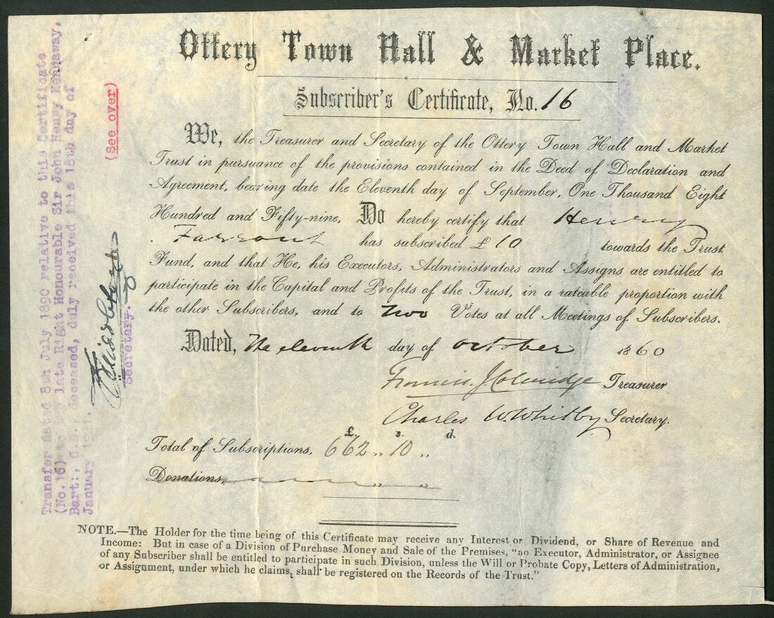 Great Britain: Ottery Town Hall & Market Place, subscriber's certificate for £10, 18[60], #16, black on vellum. Ottery St. Mary, Devon. Transfers recorded to Sir John Kennaway a governor of the Kings School in the town and a member of Parliament for Honiton. The building has, since 2018, been the home of the Ottery St.Mary Heritage Museum. GVF and the only known example.
