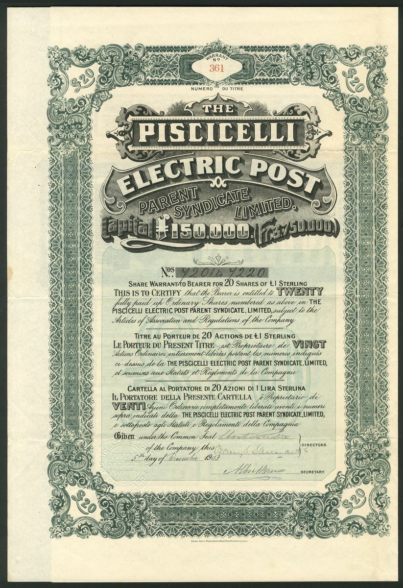Great Britain: Piscicelli Electric Post Parent Syndicate Limited, 20 shares of £1, 19[03], #361, attractive piece printed in green and black, with coupons. The company acquired the rights to Count Piscicelli's invention of a series of electric cableways to move post and parcels at fast speeds between cities. Seemed like a good idea but we can find no evidence of it ever being used apart from trials. A rare piece of which only this one seen as far as we know. GVF.