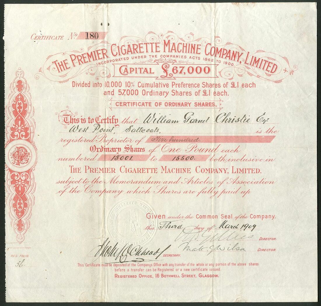 Great Britain: Premier Cigarette Machine Co. Ltd., £1 ordinary shares, [1909], #180, scrollwork at left, seal depicts the machine, red. Registsred in Edinburgh with offices in Glasgow. A large commercial cigarette making machine sold to companies in many countries. Not to be confused with the similarly named 'persona' making machine. VF and rare.