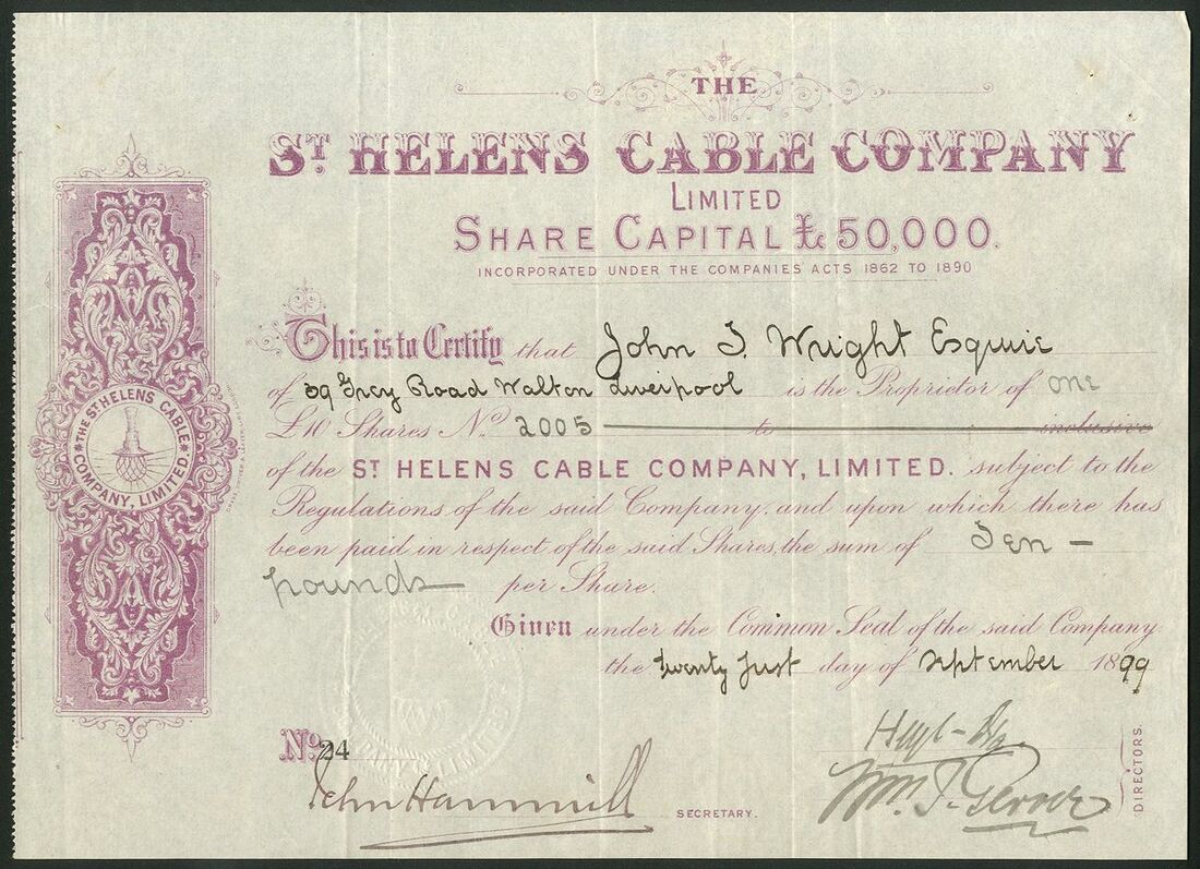 Great Britain: St.Helens Cable Co. Ltd., £10 shares, 18[99], #24, scrollwork at left, mauve. Lancashire company that manufactured electric cable for the telegraph and electrical industry. Also made the steel cables for the transporter bridge across the Mersey in 1901. Became the St.Helens Cable & Rubber Co. Ltd. in 1906 when they expanded into tyres for the growing motor industry. VF and rare.