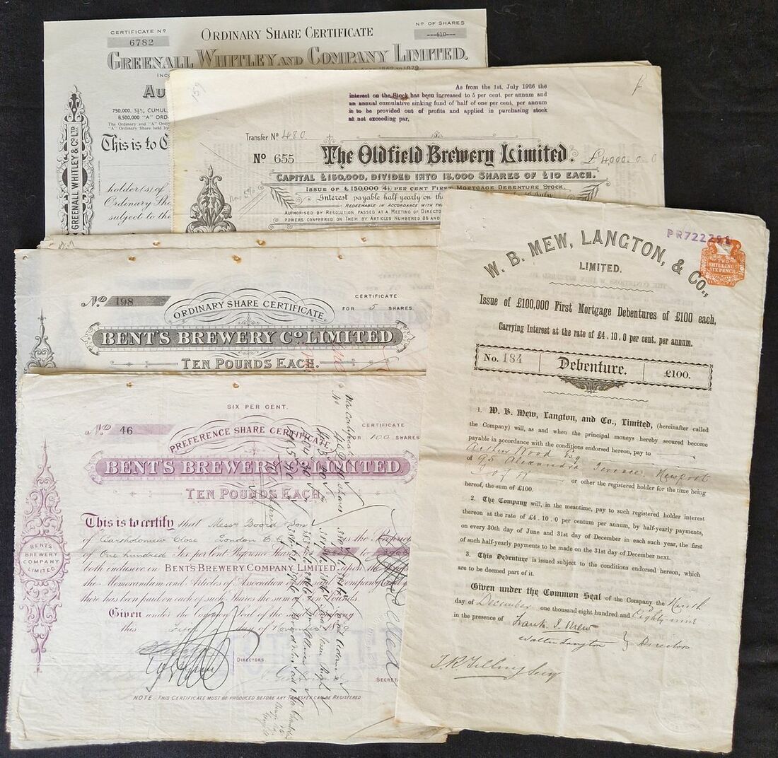 (x) Great Britain: W. B. Mew, Langton & Co. Ltd., First Mortgage 4½% debenture for £100, 18[89], #184, black, 4 pages. Mews were long standing brewers in Newport, isle of Wight. Given a royal warrant to supply Osborne House when Queen Victoria was in residence and the brewery was rename Royal Brewery. The company was formed in 1887 when Walter Langton was taken into the firm. Merged with Strongs of Romsey in 1965 which itself was acquired by Whitbread. Together with a group of cancelled brewery certificates including Bent's Brewery, 18[89] to 18[96], Oldfield Brewery Limited, 19[23], and, Greenall Whitley and Co. Ltd., 19[60].Many VF (15).