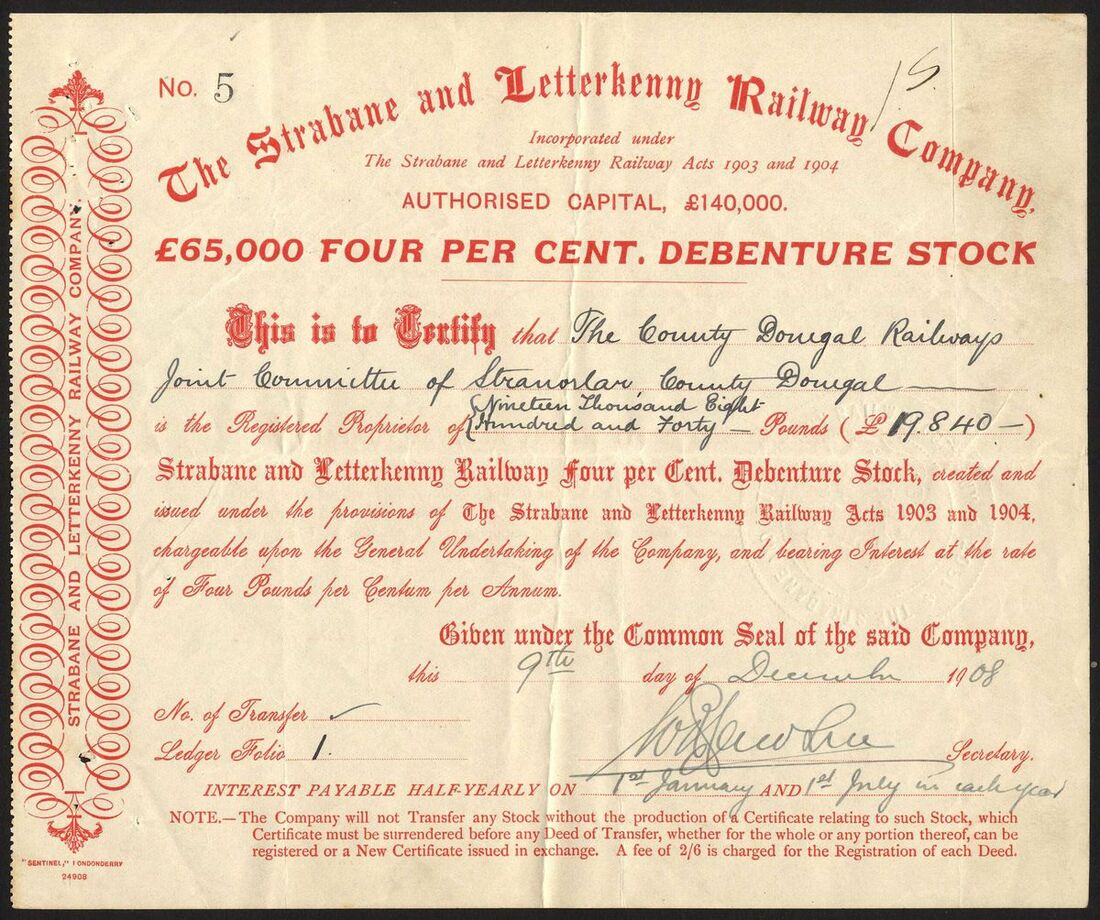 Ireland: Strabane and Letterkenny Railway Company, 4% debenture stock for £[19840] issued to County Donegal Railways Joint Committee, 19[08], #5, representing just under a third of the issue, scrollwork at left, red. A narrow gauge railway (3 feet) opened in 1909 and the last to be built in Ireland (except for slightly smaller gauges in amusement parks). It ran the 19.25 between the two towns and operated until 1960. VF and rare.