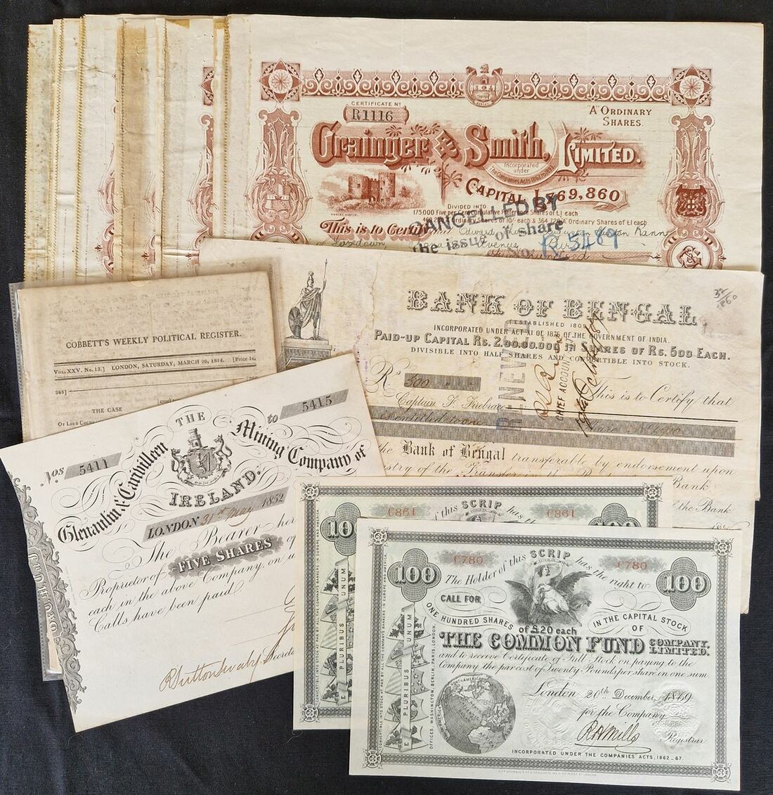 (x) Ireland: Glenaulin & Carivilleen Mining Company of Ireland, 5 shares, 1852, #5411-5, black; together with Common Fund Co. Ltd., 100 shares, 1869, 2 examples; Grainger & Smith Ltd., 'A' ordinary shares, 19[23], vignette of Dudley Castle, 10 examples, all cancelled; Bank of Bengal, 500 rupee share, 18[76], cancelled, and a copy of Cobbett's Weekly political Register, 1814 with an article on the recent Stock Exchange fraud. Mostly F-VF, the first better (14).