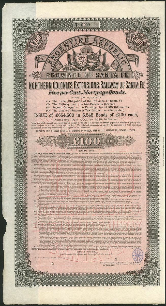 Argentine Republic, Province of Santa Fe, 5% Loan for the Northern Colonies Extensions Railway of Santa Fe, 1885, a specimen £100 bond from the Bradbury, Wilkinson archive, large format, arms at top, black, pink underprint, with coupons. Slightly uneven left edge but AEF and rare. Only two pieces found in the archive. No issued bonds seen. [R11]