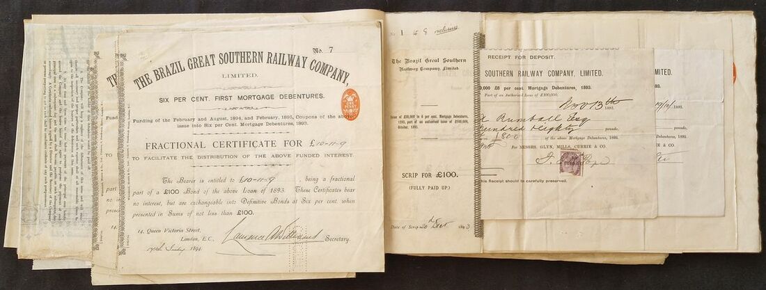 Brazil: Brazil Great Southern Railway Co. Ltd., a group of various certificates comprising 6% Mortgage Debentures, 1893, scrip certificates both issued and unissued, in original book, approximately 50 items, together with fractional certificates dated 1894 (13), and a definitive bond, #498. Generally VF to EF (Approx. 64 items).