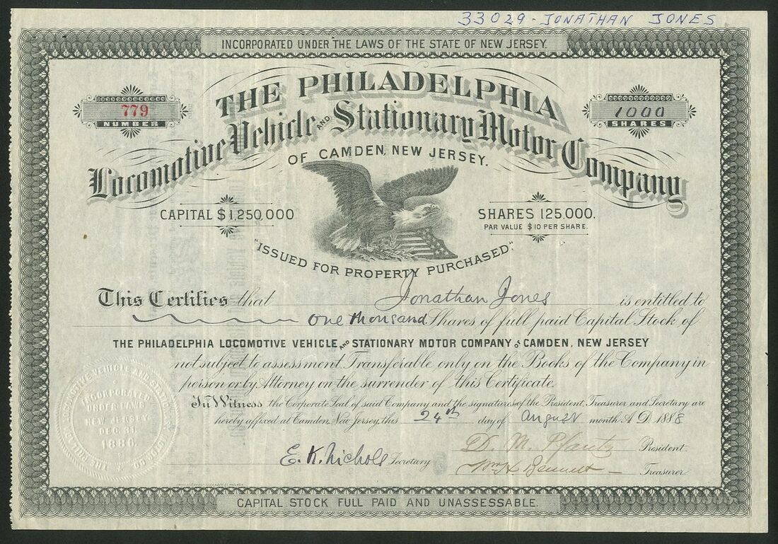 U.S.A.: Philadelphia Locomotive Vehicle and Stationary Motor Company of Camden, New Jersey, $10 shares, 188[8], #779, eagle and American shield, black. Signed by Daniel M. Pfantz of Philadelphia who had patented a spring propelled vehicle which this company purchased. VF.