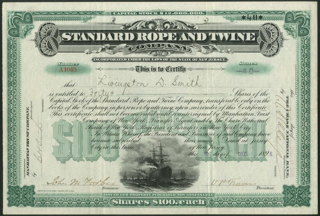 (x) U.S.A.: Standard Rope and Twine Company, $100 shares, 189[6], #A1043, vignette of steamship, green and black. Incorporated in New Jersey in 1895 as a reorganisation of the United States Cordage Company which itself was a reorganisation of the National Cordage Company. Defaulted on its mortgage payments in 1904 so receivers were appointed in the following year. Forclosed and reorganised as the Standard Cordage Company with James B. Clews as chairman and Jules S. Bache as chairman of the bondholders committee. GVF.