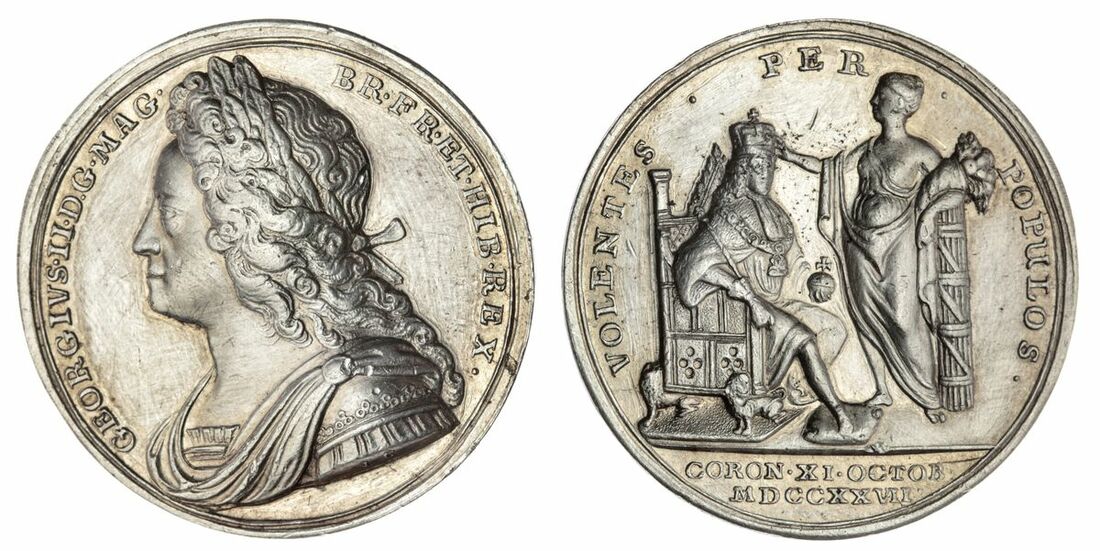George II's Coronation medal features a strikingly similar design to that of his father, with Britannia again crowning the King. In part this may have been due to the incredibly brief time that the Royal Mint had to prepare the medal, with a design approved only four days after the Privy Council requested it. Perhaps its imitation was evidence of the strengthening of the new royal house in Britain against the Jacobite tide; the crowning of a second Hanoverian monarch in direct succession from the first, 'by a willing people' as the inscription states. Ironically much like the last Catholic Stuart Monarch - James II - George II also ensured that his Consort, Queen Caroline had a separate Coronation medal produced in her likeness.