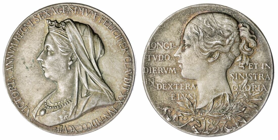 Diamond Jubilee of Victoria, Official Small AR Medal, 22 June 1897, by G. W. de Saulles after T. Brock for the Royal Mint, VICTORIA ANNVM REGNI SEXAGESIMVM FELICITER CLADVIT XX, draped and diademed bust left, rev. young head left, dividing inscription LONGITVDO SIERVM ET IN SINISTRA EIVS GLORIA, 1837 below, edge plain, 9.77g, 26mm, 12h (Eimer 1817b; BHM 3506), flecks of green verdigris to the obverse field, otherwise richly toned and with a residual lustre, nearing extremely fine