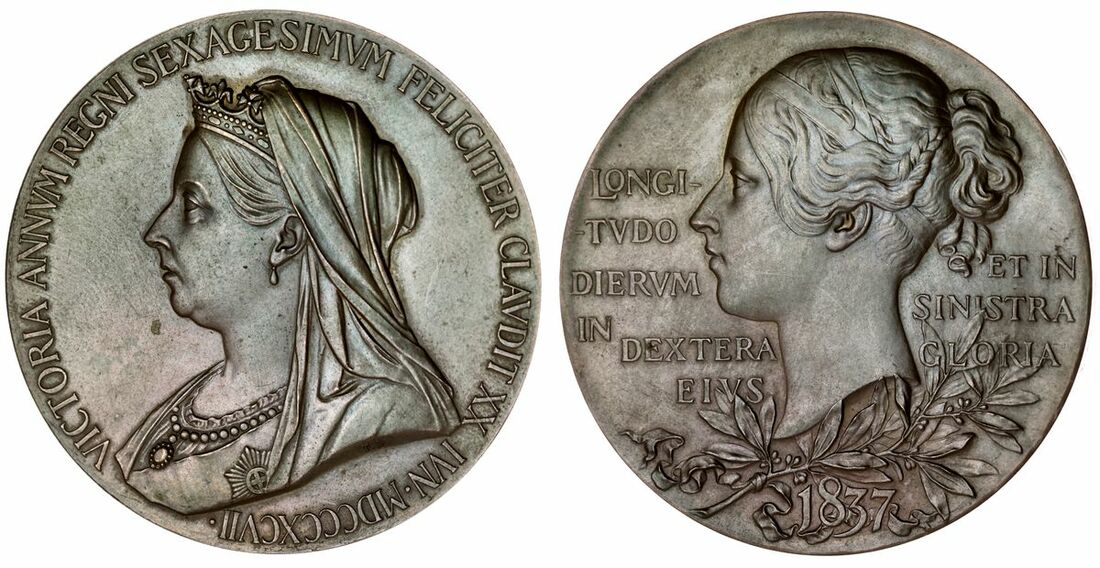 Diamond Jubilee of Victoria, Official Large AE Medal, 22 June 1897, by G. W. de Saulles after T. Brock for the Royal Mint, VICTORIA ANNVM REGNI SEXAGESIMVM FELICITER CLADVIT XX, draped and diademed bust left, rev. young head left, dividing inscription LONGITVDO SIERVM ET IN SINISTRA EIVS GLORIA, 1837 below, edge plain, 71.63g, 56mm, 12h (Eimer 1817a; BHM 3506), evidence of light fingermarks to otherwise dark chocolate surfaces, extremely fine or better, in original case of issue