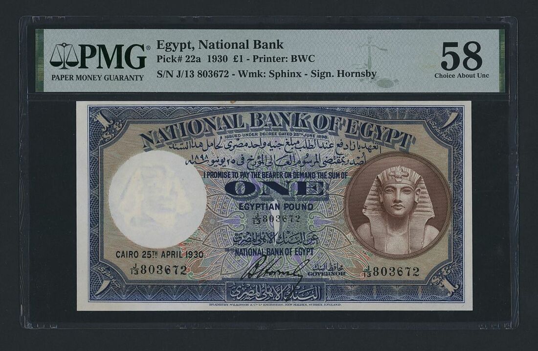 National Bank of Egypt, £1, 25th April 1930, serial number J/13 803672, (Pick 22a, BNB 121), in PMG holder 58 Choice About Uncirculated, only 7 notes in higher grades at PMG