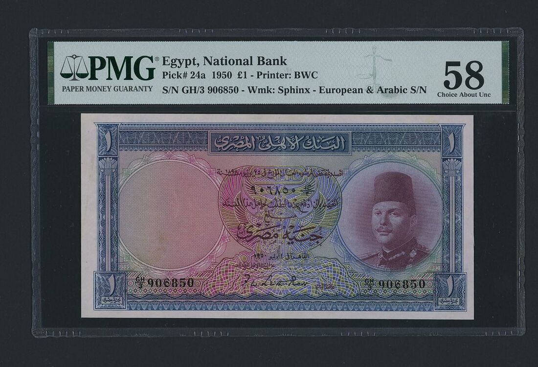National Bank of Egypt, £1, 1950, serial number GH/3 906850, (Pick 24a, BNB 123), in PMG holder 58 Choice About Uncirculated