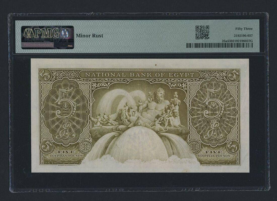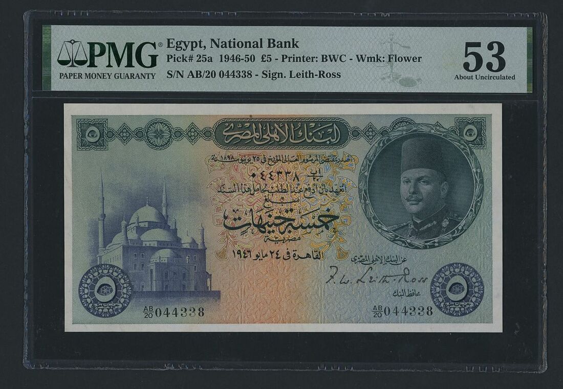 National Bank of Egypt, £5, 1946-50, serial number AB/20 044338, (Pick 25a, BNB 124), in PMG holder 53 About Uncirculated, minor rust