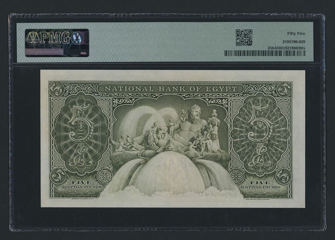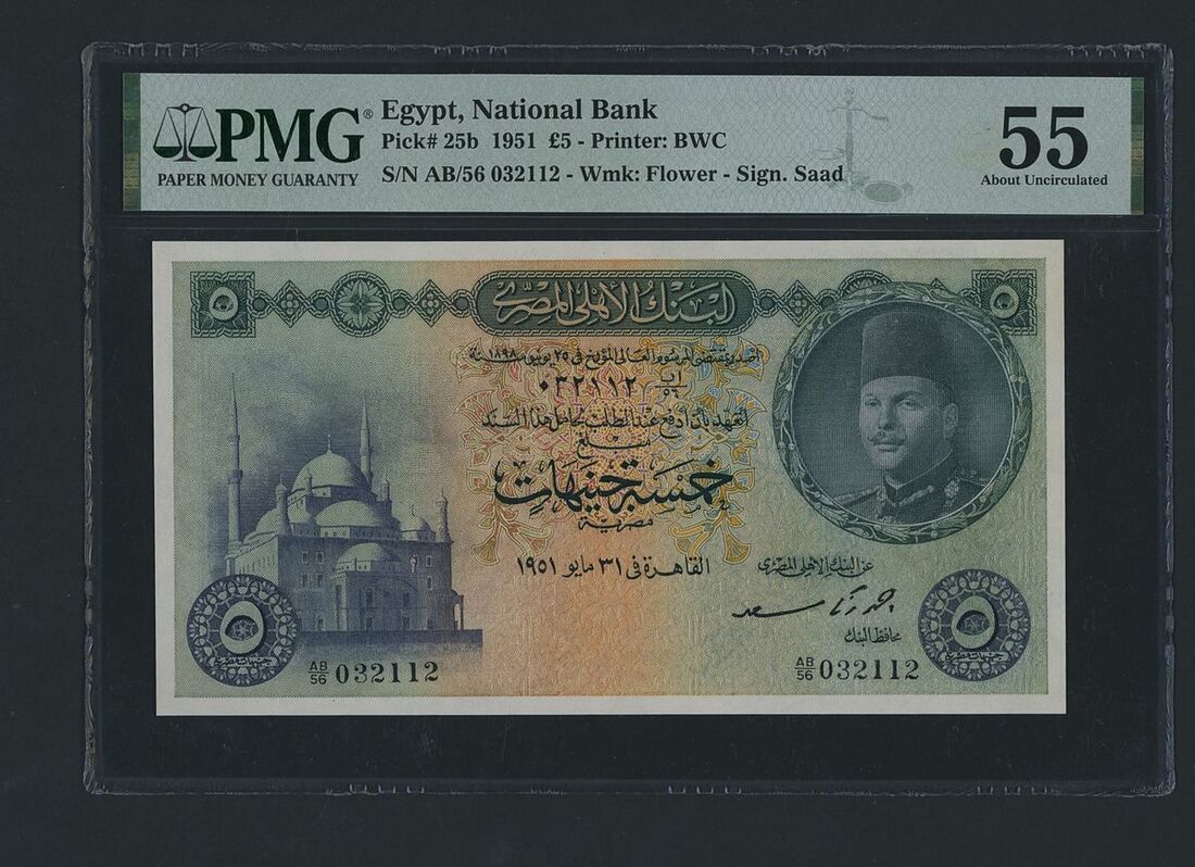 National Bank of Egypt, £5, 1951, serial number AB/56 032112, (Pick 25b, BNB 124), in PMG holder 55 About Uncirculated