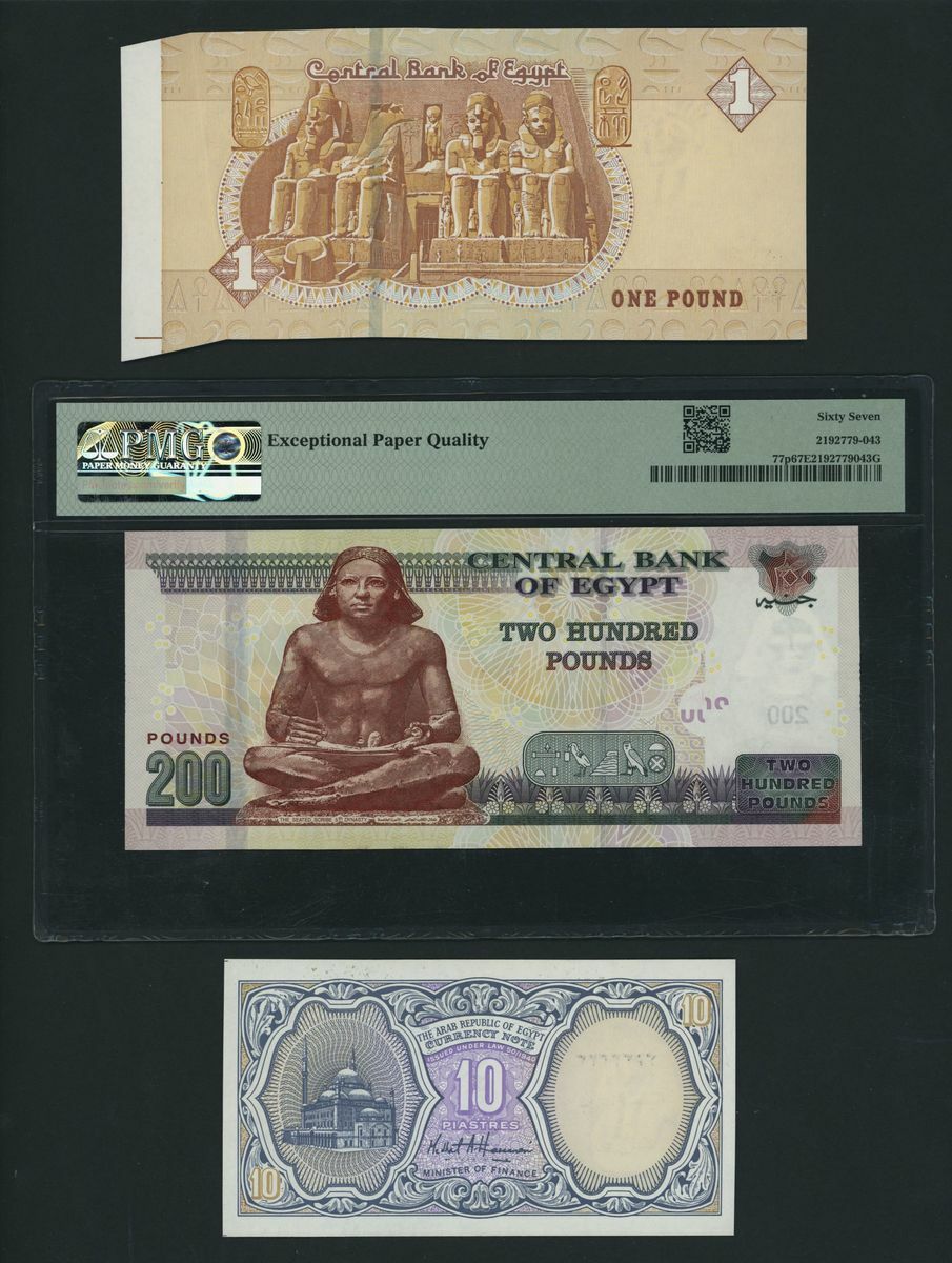 Central Bank, Republic, Egypt, [3 notes] 10 Piastres, £1, £200, 2002-2022, £200, 29th November 2022, serial number 451/Y 1606566; 10 Piastres, 2002, serial number 3333333; £1 miscut, 8th July 2020, serial number 109/ L 7156491