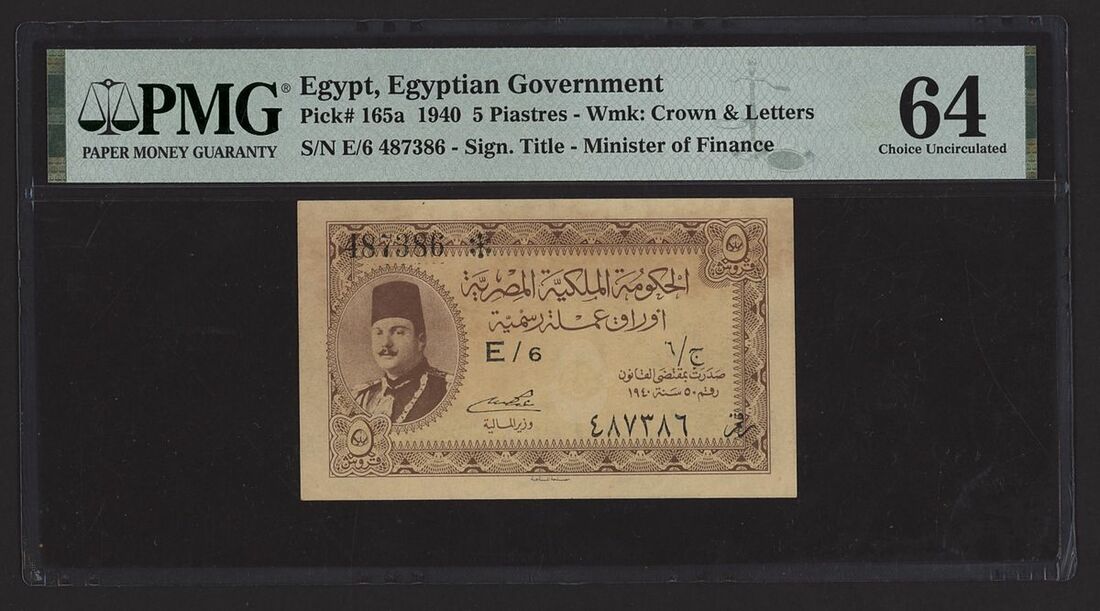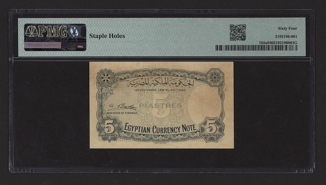 Egyptian Government, 5 Piastres, 1940, serial number E/6 487386, (Pick 165a, BNB 212), in PMG holder 64 Choice Uncirculated, staple holes