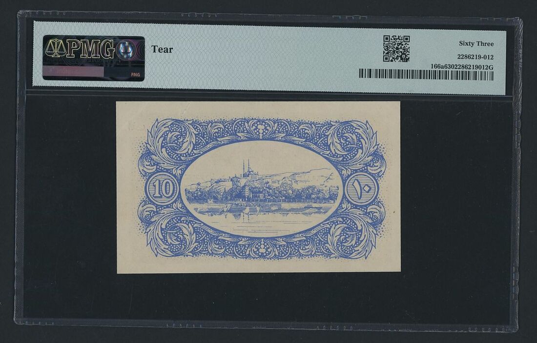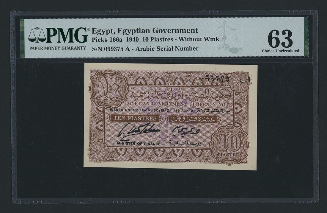 Egyptian Government, 10 Piastres, 1940, serial number 099375 A - Arabic serial number, (Pick 166a, BNB 209), in PMG holder 63 Choice Uncirculated, tear