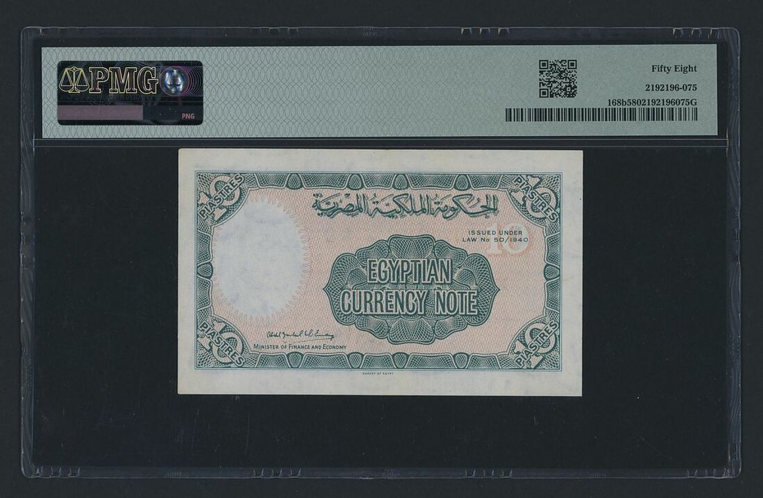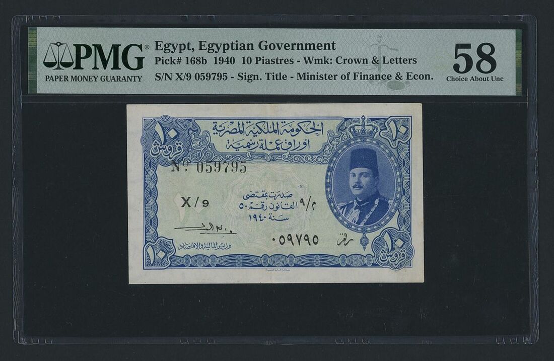 Egyptian Government, 10 Piastres, 1940, serial number X/9 059795, (Pick 168b, BNB 213), in PMG holder 58 Choice About Uncirculated