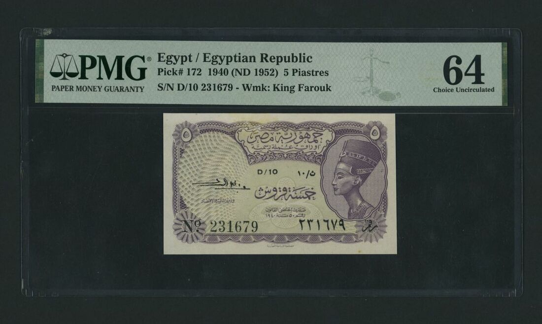 Egyptian Republic, 5 Piastres, 1940, serial number D/10 231679, (Pick 172, BNB 218), in PMG holder 64 Choice Uncirculated