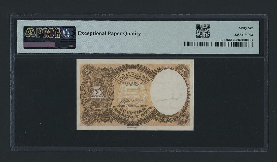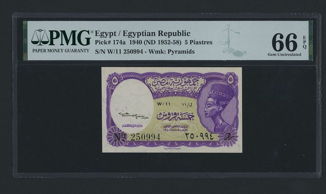 Egyptian Republic, 5 Piastres, 1940 (ND 1952-58), serial number W/11 250994, (Pick 174a, BNB 219), in PMG holder 66 EPQ Gem Uncirculated, only 6 notes in higher grades at PMG