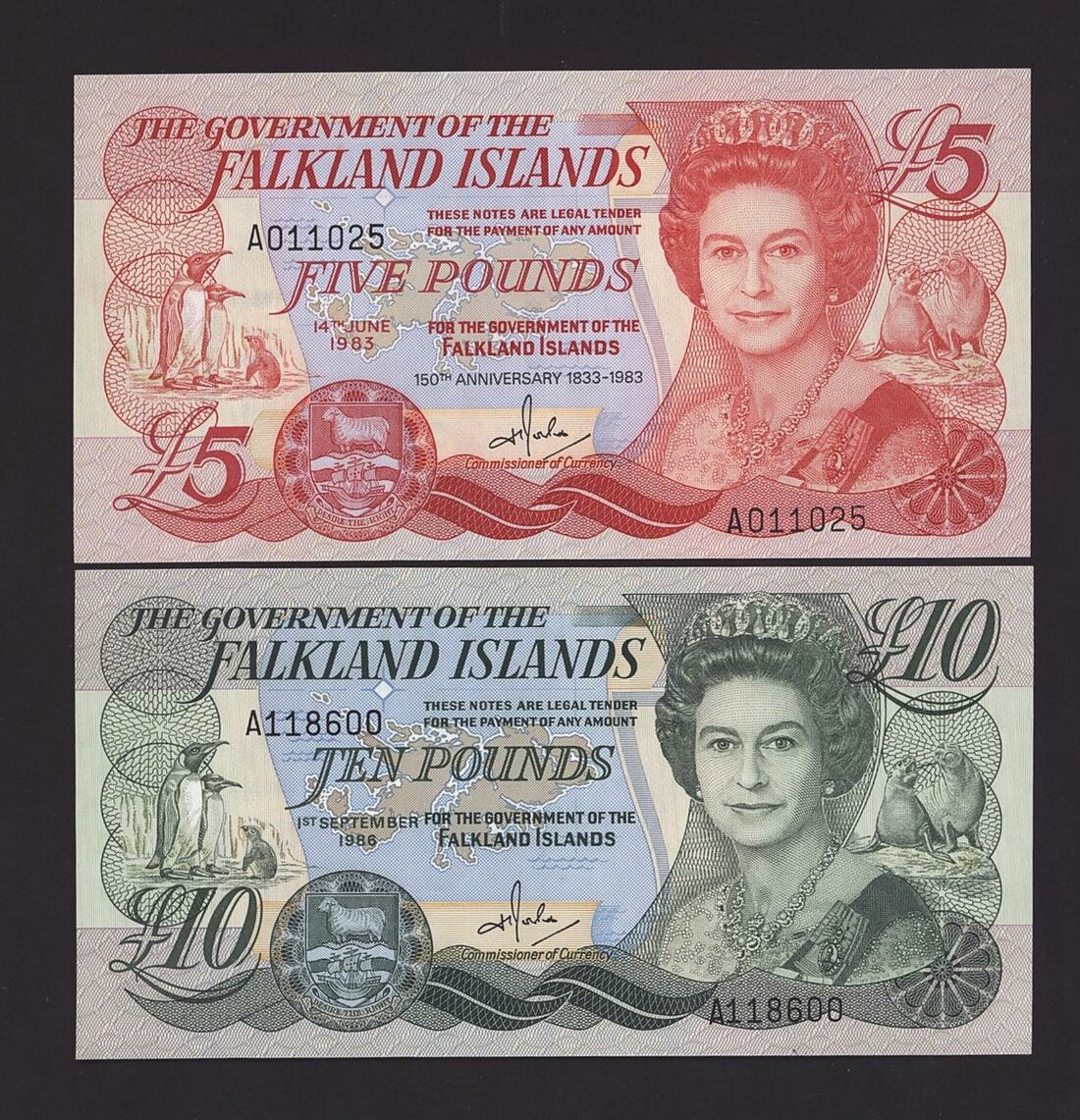 The Government of the Falkland Islands, [5 notes] 50p, £1, £5, £10, 1974-1986, (Pick 8b, 10a, 12a, 13a, 14a, BNB 213b, 215b, 217a, 218a, 220a), very fine to about uncirculated (5 notes)